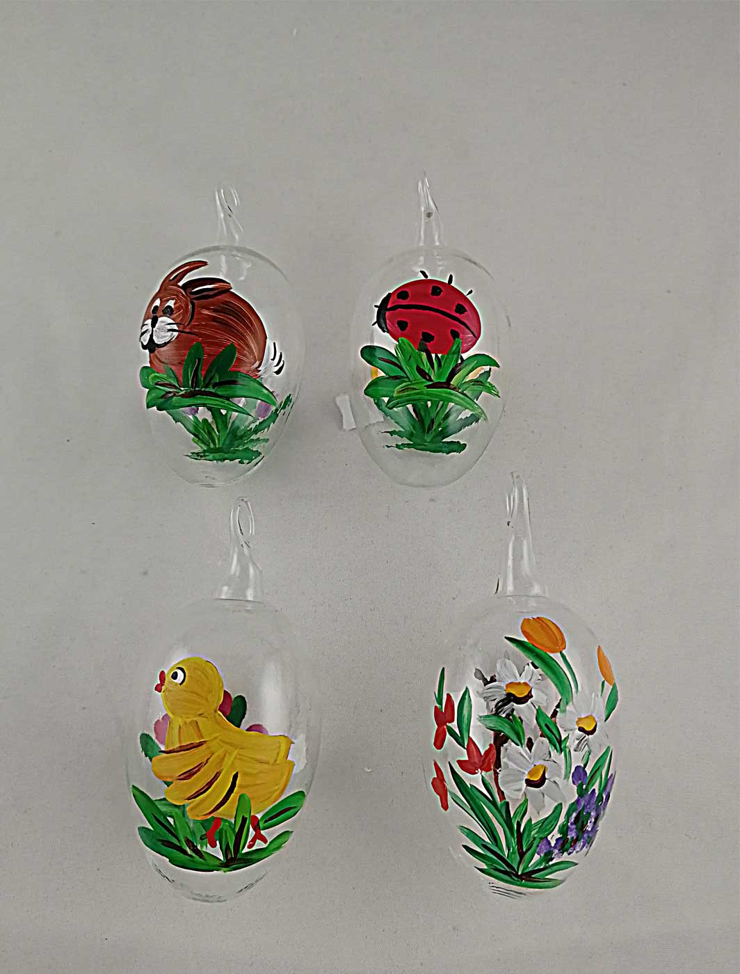 Diese mundgeblasene und teilflächig handbemalte Glaseier zeigen Oster- und Blumenmotive