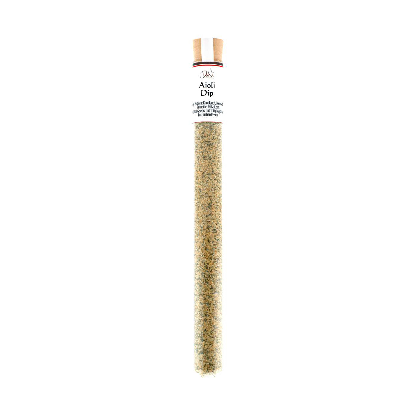 Ein praktisches Reagenzglas, welches mit dem Gewürz “Aioli Dip” gefüllt ist. Es eignet sich hervorragend als Ergänzung zu einem Geschenk, als Teil eines Feinkost-Geschenkes oder als kleines Mitbringsel! Zudem können die kleinen Reagenzgläser perfekt auf Servierbrettern gebunden, in unsere großen Vorratsgläser oder Tassen gesteckt oder an Blumensträuße gehangen werden. Immer ein echter Hingucker!