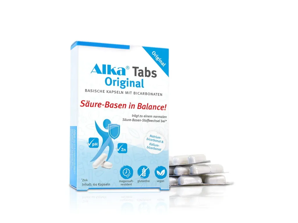 Alka® Tabs Original enthält magensaftresistente Kapseln mit Kaliumbicarbonat, Natriumbicarbonat und Zink.