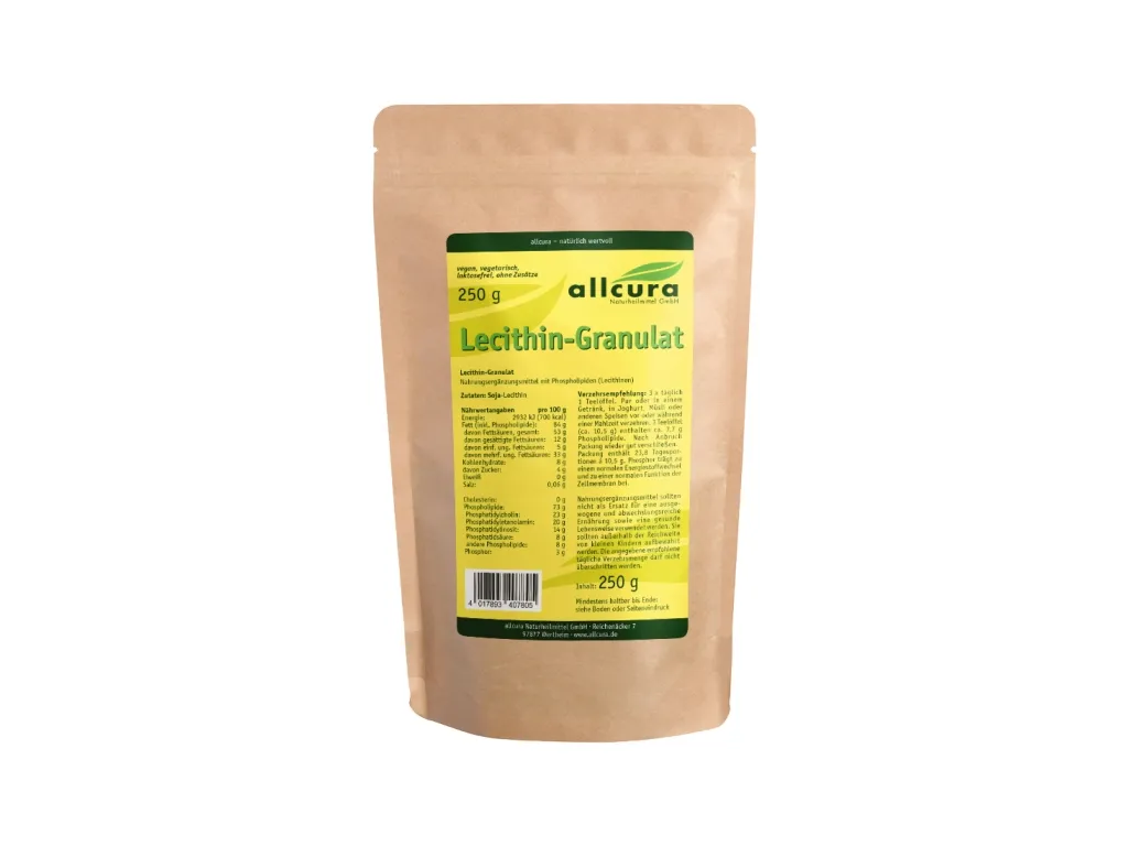 Rein pflanzliches Sojalecithin in granulierter Form. Enthält einen Gesamtphosholipid-Komplex von ca. 97%. Lecithine sind natürlicherweise an vielen Stoffwechselvorgängen beteiligt.