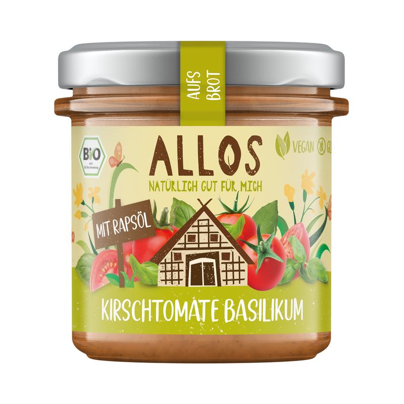Allos Bio Brotaufstrich aufs Brot mit Kirschtomaten und Basilikum