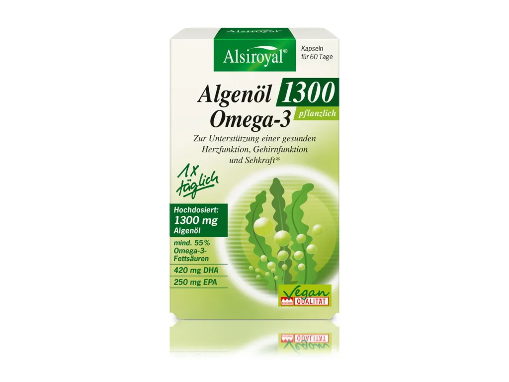 Algen sind die einzige pflanzliche Omega-3-Quelle, bei der die wichtigen Omega-3-Fettsäuren DHA (Docosahexaensäure) und EPA (Eicosapentaensäure) in einer vom Körper direkt verwertbaren Form vorliegen. Alsiroyal ® Algenöl Omega-3 ist damit eine gute pflanzliche/ vegane Alternative zu Fischölkapseln und stellt eine hochdosierte Versorgung mit DHA und EPA sicher. Ganz ohne Fisch.