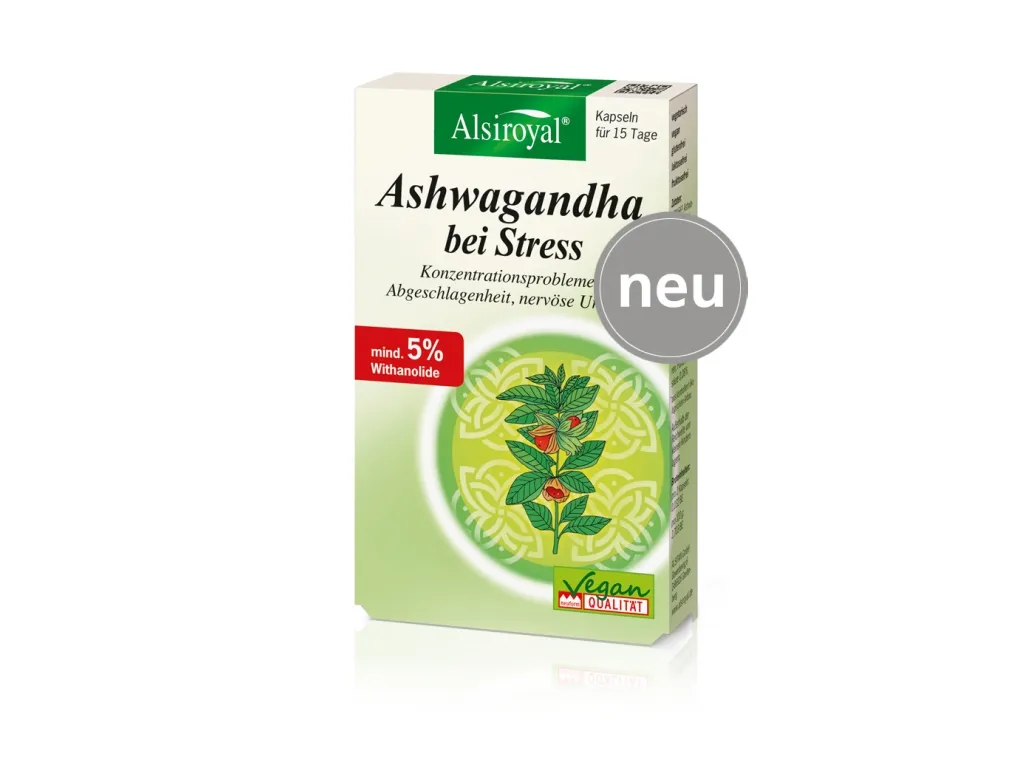 Alsiroyal® Ashwagandha bei Stress enthält den reinen Ashwagandha-Wurzelextrakt KSM-66® mit mind. 5 % Withanoliden. Er wirkt unterstützend in Zeiten mentaler und nervöser Anspannungen und trägt zu seelischem und physischem Wohlbefinden sowie emotionaler Balance bei. Pantothensäure unterstützt Ihre Vitalität, indem es zur Verringerung von Müdigkeit und Erschöpfung sowie zu einer gesunden geistigen Leistungsfähigkeit beiträgt.