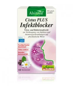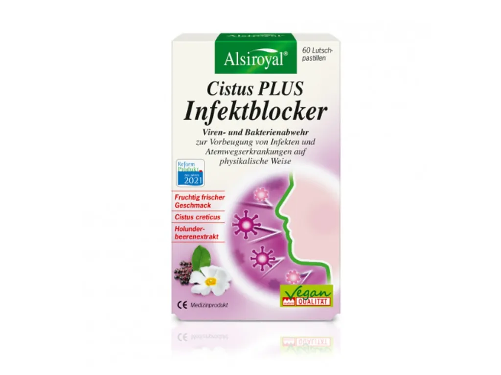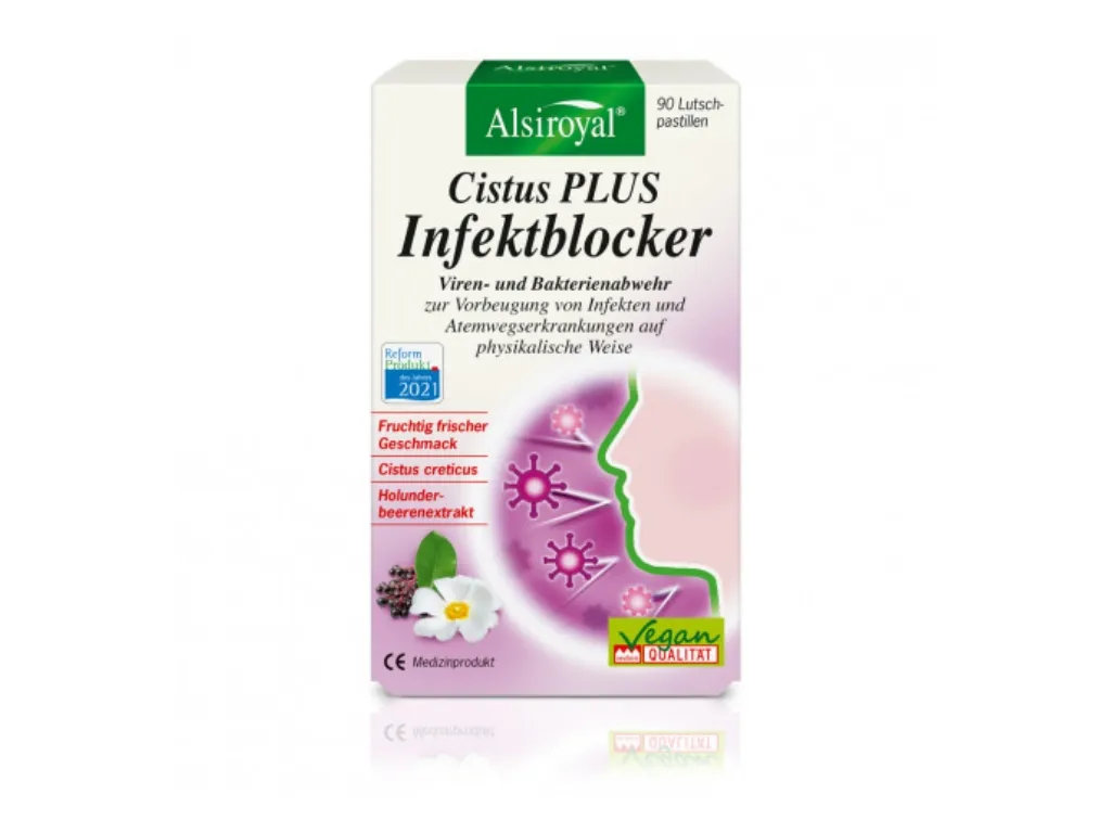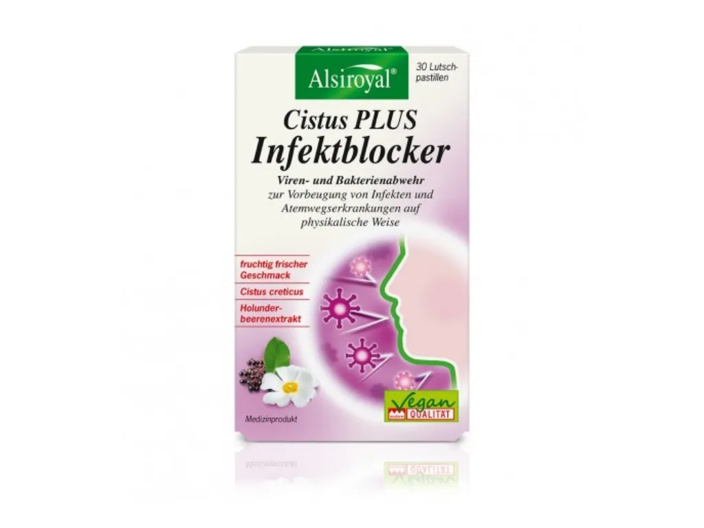 Die regelmäßige Anwendung von Alsiroyal® Cistus PLUS Infektblocker in Zeiten erhöhter Ansteckungsgefahr unterstützt die Abwehr von Viren und Bakterien durch Bildung einer physikalischen Schutzbarriere auf den Mund- und Rachenschleimhäuten. Wie ein Schutzschild legen sich die Polyphenole (Gerbstoffe) des Cistus creticus- und Holunderbeerenextraktes über die Mund- und Rachenschleimhäute und helfen so, Viren und Bakterien abzuwehren, bevor sie in den Körper gelangen. Aufgrund der physikalischen Wirkungsweise gibt es keine Resistenzbildung. Diese standardisierten Spezialextrakte ermöglichen eine hohe effektvolle Dosierung von Polyphenolen von über 300 mg pro Tagesdosis.