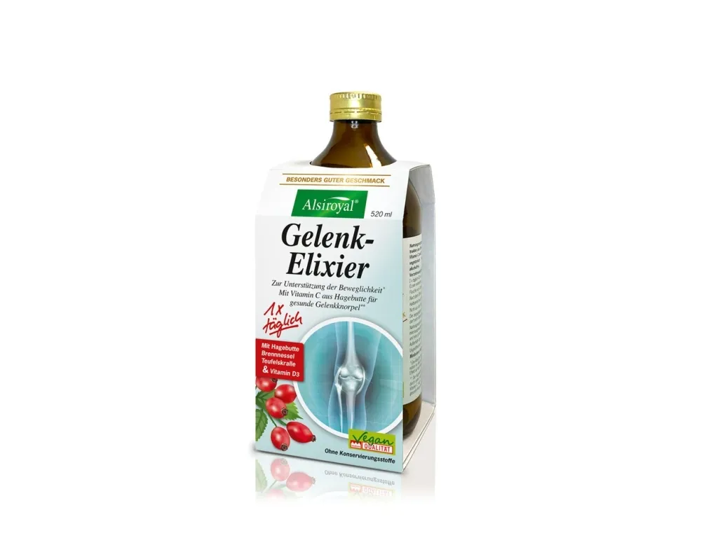 Alsiroyal® Gelenk-Elixier enthält eine ausgewogene natürliche Komposition aus Hagebutte, den Extrakten von Brennnesselblättern und der Teufelskrallenwurzel sowie Vitamin C und D. Das Vitamin D wird rein pflanzlich aus Algen gewonnen. Zusammen mit dem guten Geschmack macht dies die regelmäßige Anwendung besonders angenehm.