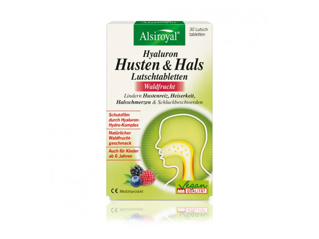 Das Medizinprodukt Alsiroyal® Hyaluron Husten & Hals Lutschtabletten bildet beim Lutschen einen physikalisch wirkenden Hyaluron-Hydro-Komplex. Dieser kann besonders viel Feuchtigkeit speichern und legt sich wie ein Schutzfilm über die Mund-, Hals- und Rachenschleimhaut. So wird die gereizte Schleimhaut nicht nur wirkungsvoll, sondern auch langanhaltend befeuchtet. Hustenreiz, Heiserkeit, Halsschmerzen und Schluckbeschwerden werden spürbar gelindert. Die gereizte Schleimhaut kann sich wieder beruhigen. Das Eindringen weiterer Bakterien und Viren wird zudem durch die entstandene physikalische Schutzbarriere erschwert und die natürliche Abwehrfunktion der Schleimhaut wird unterstützt.