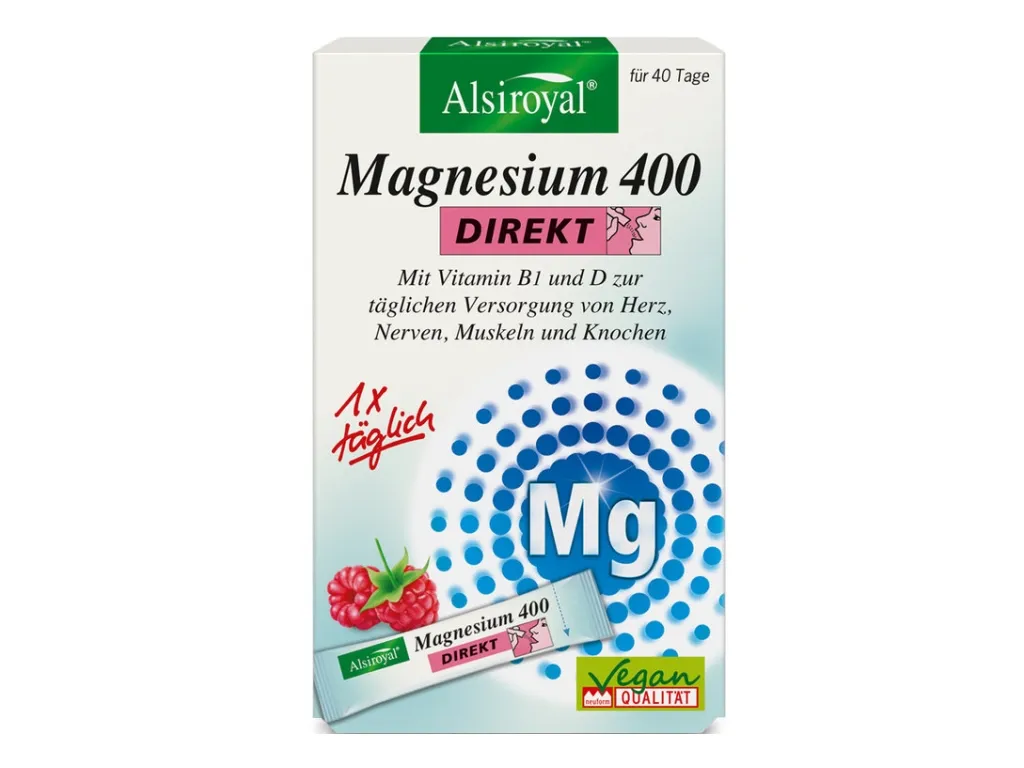 Magnesium ist ein lebensnotwendiger Mineralstoff, den der Körper nicht selbst bilden kann. Alsiroyal® Magnesium 400 DIREKT versorgt Sie nicht nur mit wichtigen Nährstoffen für Herz, Nerven, Muskeln und Knochen, sondern hat auch einen wohlschmeckenden Zitronengeschmack – ohne Zucker.