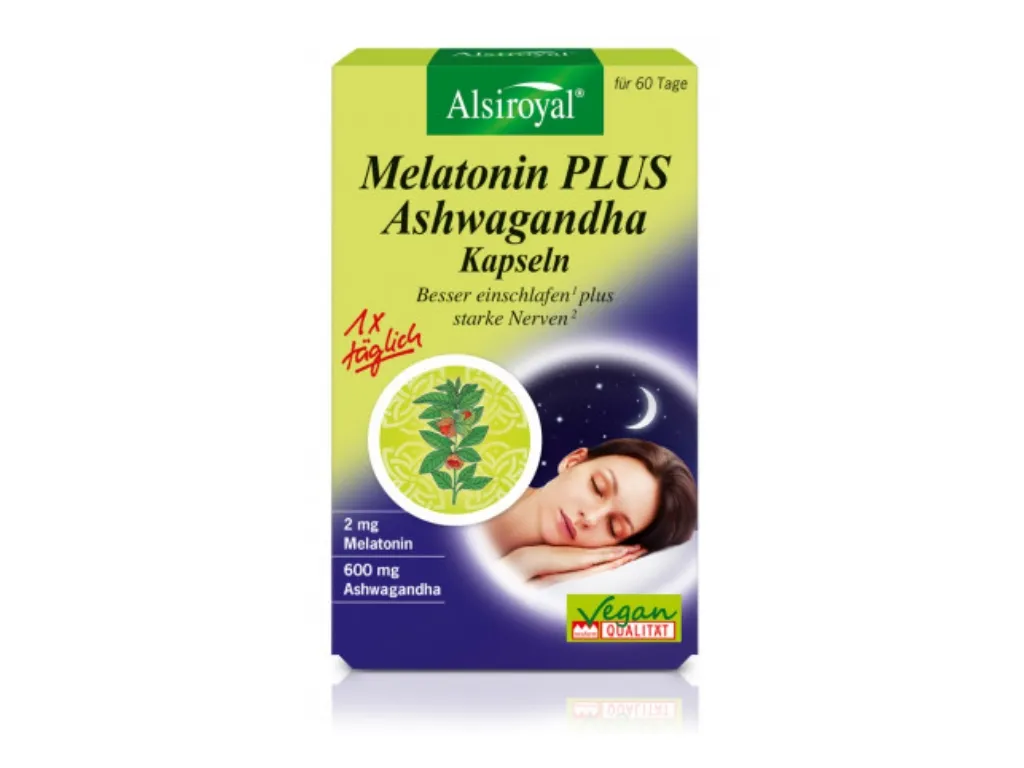 Täglicher Stress, Leistungsdruck, Hektik oder ein zu niedriger Melatoninspiegel können der Grund dafür sein, dass man abends schlechter einschläft und sich den vielfältigen Anforderungen tagsüber nicht mehr gewachsen fühlt. Alsiroyal® Melatonin PLUS Ashwagandha Kapseln verbinden die gute Wirkung des körpereigenen Schlafbotenstoffs Melatonin mit einem reinen Ashwagandha-Wurzelextrakt (KSM-66®) sowie den Vitaminen B5 (Pantothensäure) und B6. Melatonin trägt dazu bei, die Einschlafzeit zu verkürzen. Die indische Pflanze Ashwagandha wird aufgrund ihrer besonderen Pflanzenstoffe seit langem im Ayurveda eingesetzt. Pantothensäure trägt zu einem gesunden Energiestoffwechsel und einer normalen geistigen Leistungsfähigkeit bei. Vitamin B6 trägt zu einer normalen Funktion des Nervensystems bei.