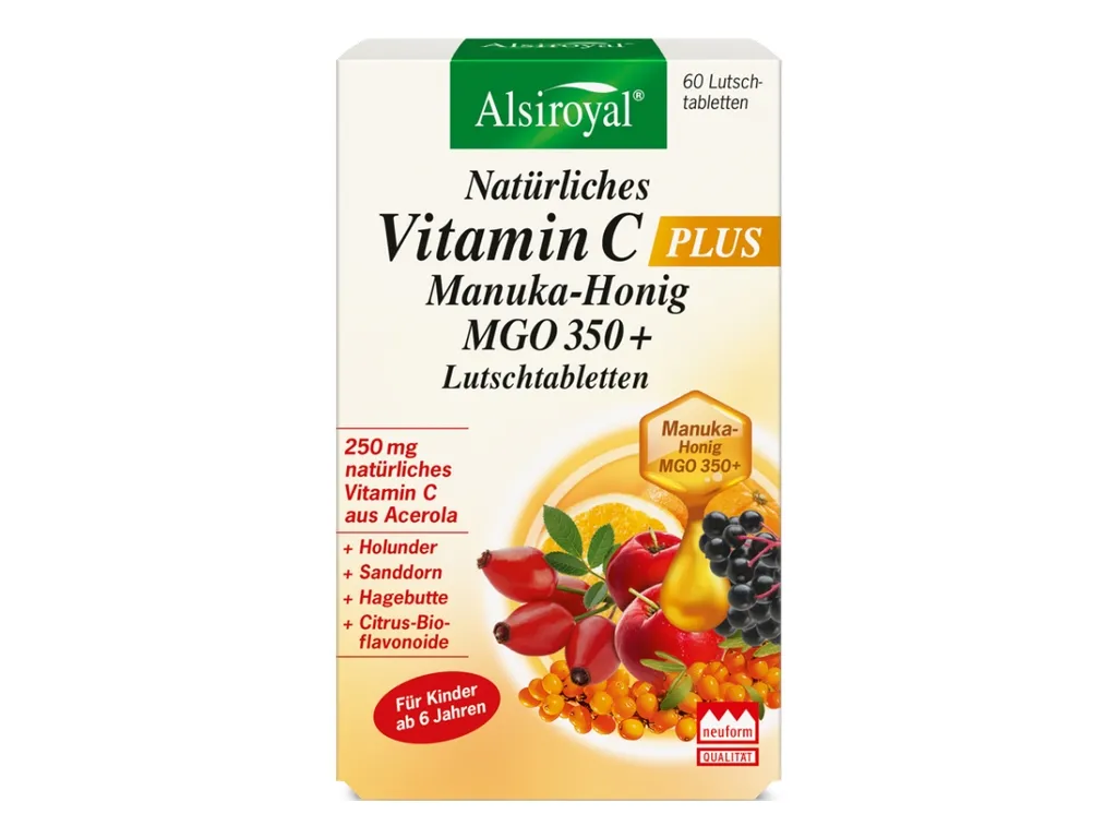Vitamin C gehört zu den wichtigsten Vitaminen im menschlichen Körper, kein anderes Vitamin unterstützt die Gesundheit auf so vielfältige Weise. Mit unserem Alsiroyal® Natürliches Vitamin C PLUS Manuka-Honig MGO 350+ gehen wir bewusst einen besonderen Weg. Denn das Vitamin C in den angenehm fruchtig schmeckenden Lutschtabletten ist zu 100 % natürlichen Ursprungs. Die dafür verwendeten Acerolakirschen zählen zu den Vitamin C-reichsten Früchten der Welt. Ergänzt wird die natürliche Rezeptur durch Sanddorn, Hagebutte, Holunderbeere und Citrus-Bioflavonoiden, gekrönt von dem innovativen Manuka-Honigpulver MGO 350+. Denn der Honig aus dem Nektar der Manuka-Blüten gilt als einer der wertvollsten Honige der Welt, ein hoher Gehalt an MGO ist ein Zeichen für hohe Qualität.