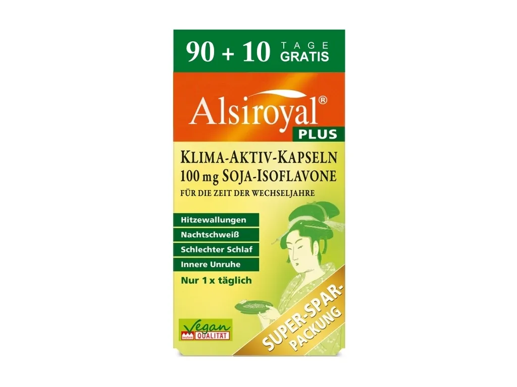 Alsiroyal® “PLUS Klima-Aktiv Kapseln 100 mg Soja-Isoflavone” enthält pro Tag 150 µg Biotin. Biotin kann bestimmte Labortests (Blutuntersuchung) beeinflussen. Daher informieren Sie bitte Ihren Arzt über die Einnahme, sollte bei Ihnen ein solcher Test durchgeführt werden.