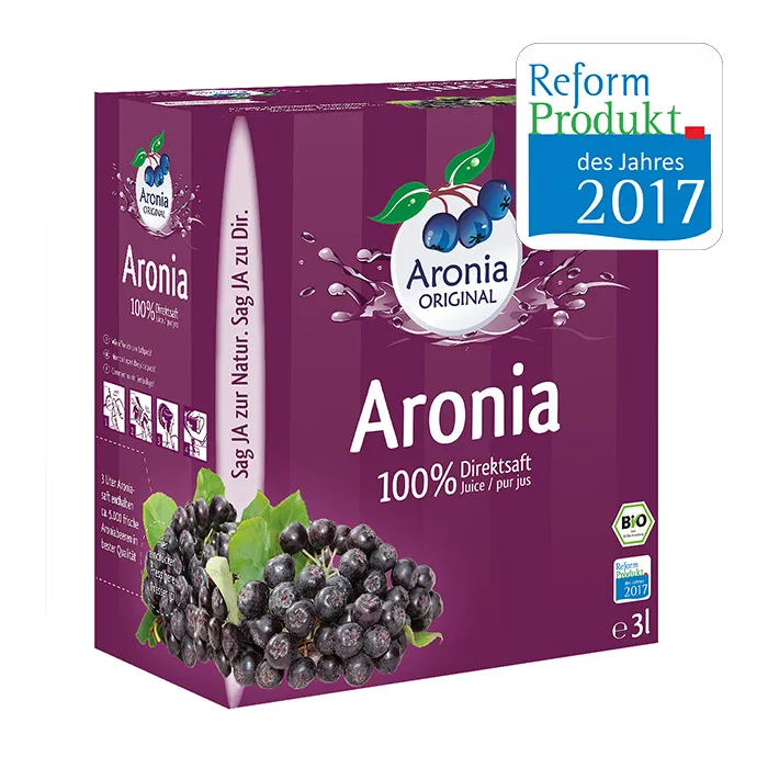 Aroniasaft 100% Bio Direktsaft – das ist 100% purer Aronia-Muttersaft in ausgewählter Bio-Qualität. Direkt gepresst darf er daher auch den Namen Direktsaft tragen. Er enthält keinerlei Zusätze, wie z.B. Konservierungs,- Farb,- und Aromastoffe (lt. Gesetz). Das Bio-Siegel sichert Ihnen beste Verarbeitung aus hochwertigen Rohstoffen. Die schonende Verarbeitung ist ein weiteres Gütemerkmal.