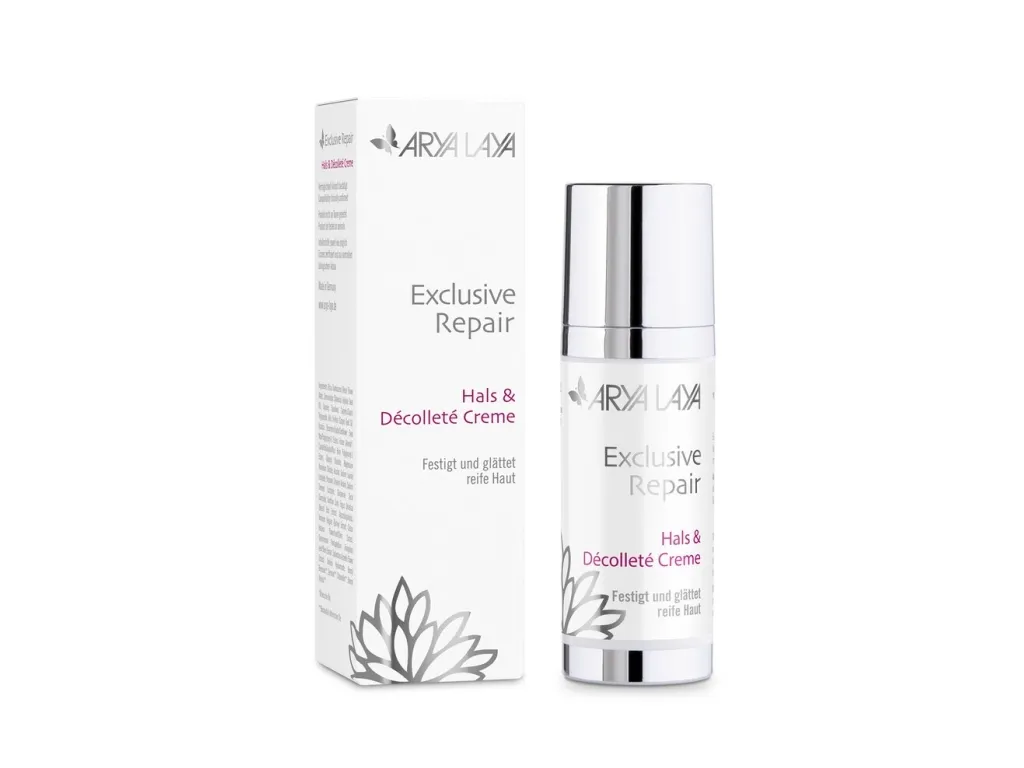 Anspruchsvolle Anti-Aging Pflege mit Fünffach-Wirkung gegen die Zeichen der Zeit. Exclusive Repair verbessert nachhaltig die Feuchtigkeit, Festigkeit, Faltentiefe, Elastizität und Glätte der Haut. Die empfindliche Haut an Hals und Décolleté bedarf besonders wirkungsvoller Pflege. Ein innovativer Wirkkomplex mit Frauenginseng, Zistrose und Aminosäuren aktiviert die Hautzellen, stärkt das Gewebe und versorgt die Zellen mit neuer Energie. Parakresse und bioaktive Hyaluronsäure remodellieren das Kollagen- und Elastinnetz und füllen Falten langanhaltend mit Feuchtigkeit auf. Knitterfältchen werden gemildert, die Haut an Hals und Décolleté wirkt deutlich glatter und straffer. Zart duftendes Rosenwasser erfrischt und tonisiert, Oryzanol schützt die sensible Haut von Hals und Décolleté vor sonnenbedingter Hautalterung.