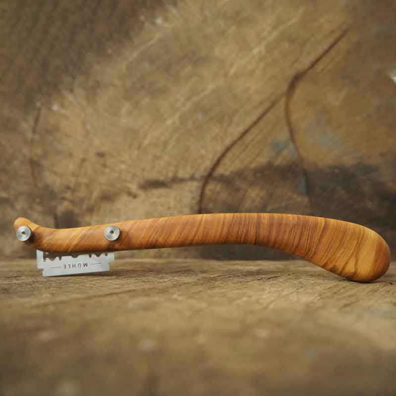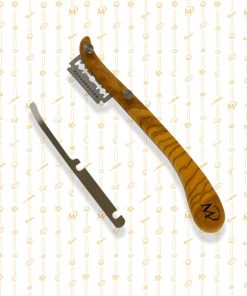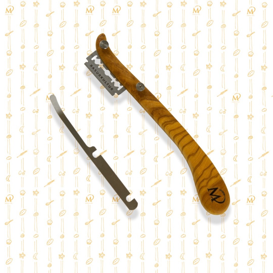 Mit diesem handgefertigten Bäckermesser oder Lame de boulanger aus Olivenholz schneidest du deine Teiglinge schnell und präzise ein. Der edle, handgefertigte Holzgriff liegt angenehm in der Hand und die Klinge lässt sich problemlos auswechseln. Jedes Messer wird in liebevoller Handarbeit hergestellt, die Maserung des Holzes kann daher leicht vom Bild abweichen.