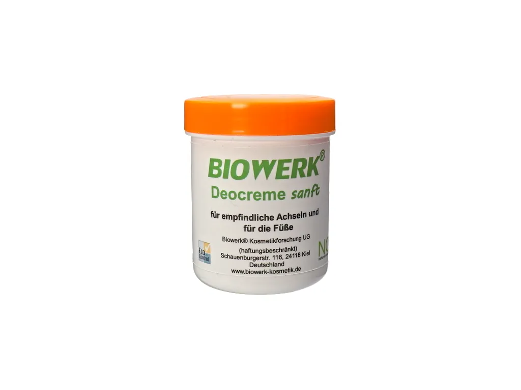 Die Biowerk® Deocreme sanft enthält Zinc Ricinoleat. Das ist das Zinksalz der natürlich vorkommenden Ricinolsäure aus dem Wunderbaum. Es kann den Schweißgeruch und den Fußgeruch binden. Es kann auch bereits vorhandenen Schweiß- und Fußgeruch absorbieren. Zinc Ricinoleat kann sogar Schwefelverbindungen wie z.B. aus dem Knoblauch oder Amine z.B. aus dem Fisch absorbieren.
