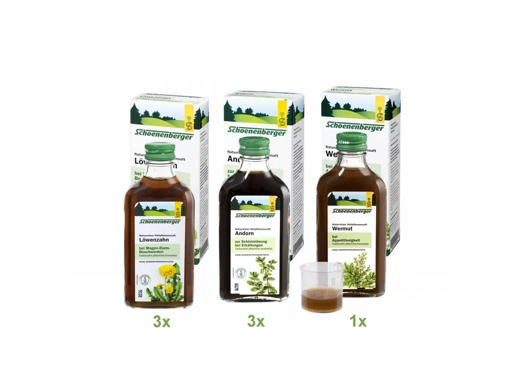 3 Flaschen Löwenzahnsaft, 3 Flaschen Andornsaft und 1 Flasche Wermutsaft
