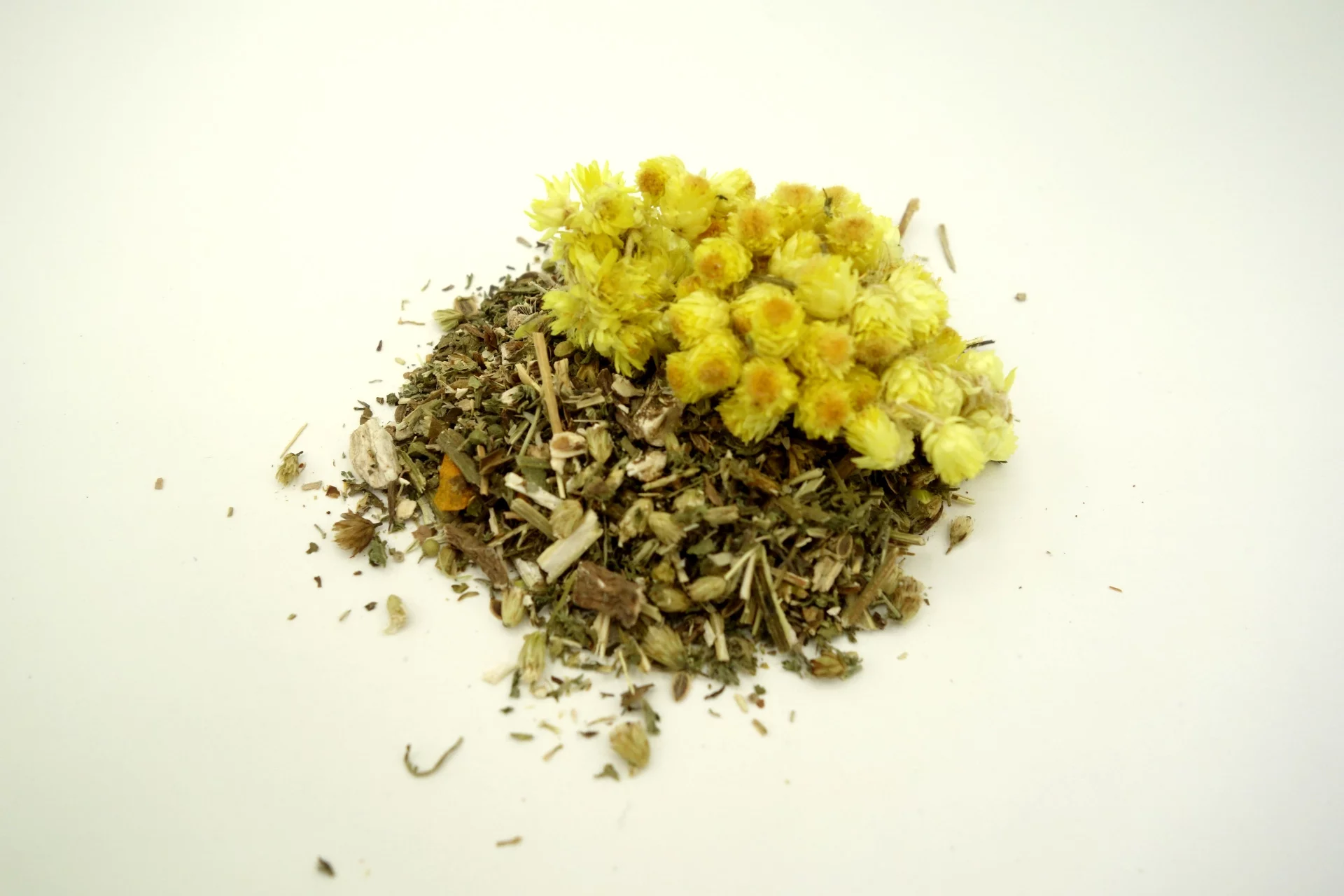 Zutaten: Löwenzahnwurzel mit -Kraut*, Schafgarbenkraut* (20 %), Gelbwurz*, Erdrauchkraut*, Katzenpfötchen*, Dillsamen* (5 %), Wermut* (5 %), Wegwartenwurzel* (5 %).