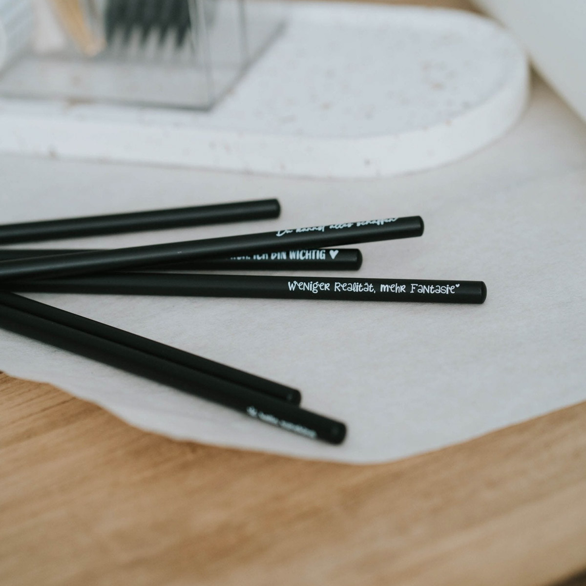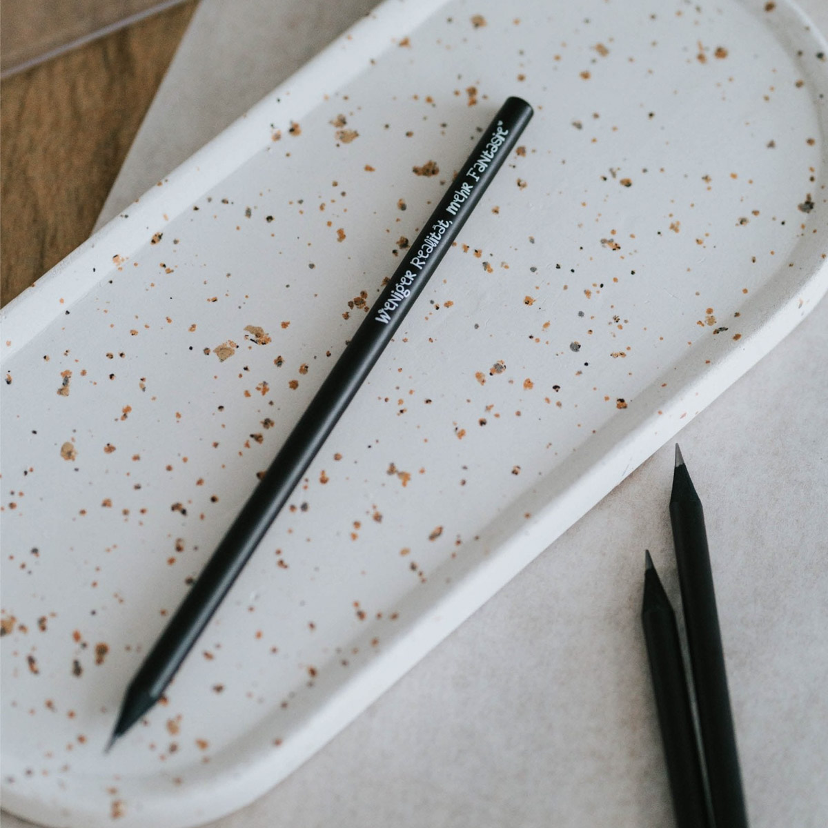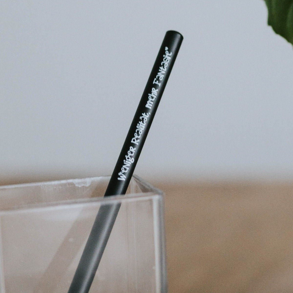 Bleistift | Motiv “Weniger Realität mehr Fantasie” | rund | Durchmesser 7 mm | Härtegrad HB | Holzschaft schwarz | Tauchkappe in schwarz | ohne Dekoration