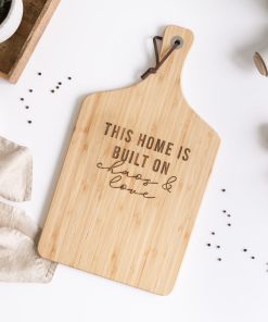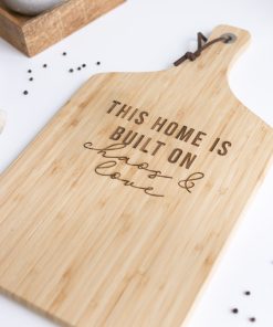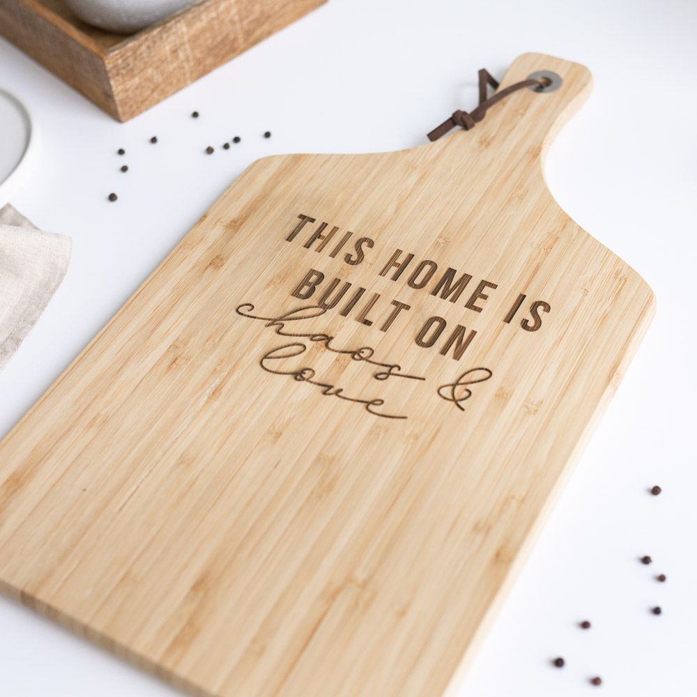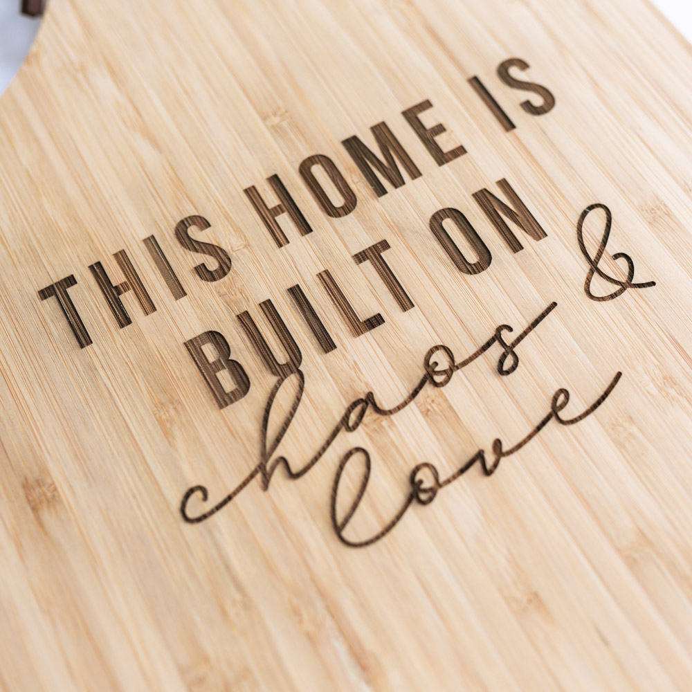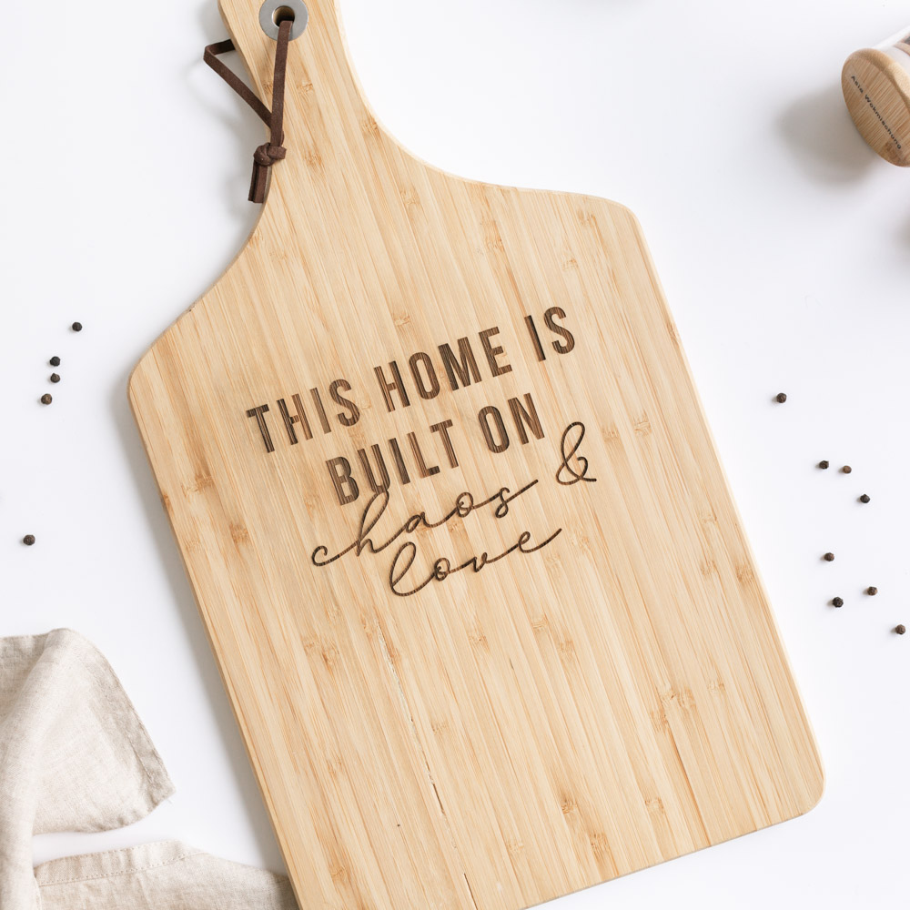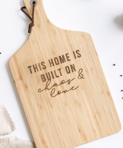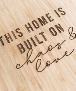 Ein dekoratives Schneidebrett aus Baumbus für eure Küche & den Küchentisch, welches mit dem Spruch this home is built on chaos & love lasergraviert wurde. Das Servierbrett eignet sich perfekt zur Dekoration der Küche oder zum Anrichten von Leckereien. Das Schneidebrett ist aus umweltfreundlichem & hochwertigem Bambus gefertigt.