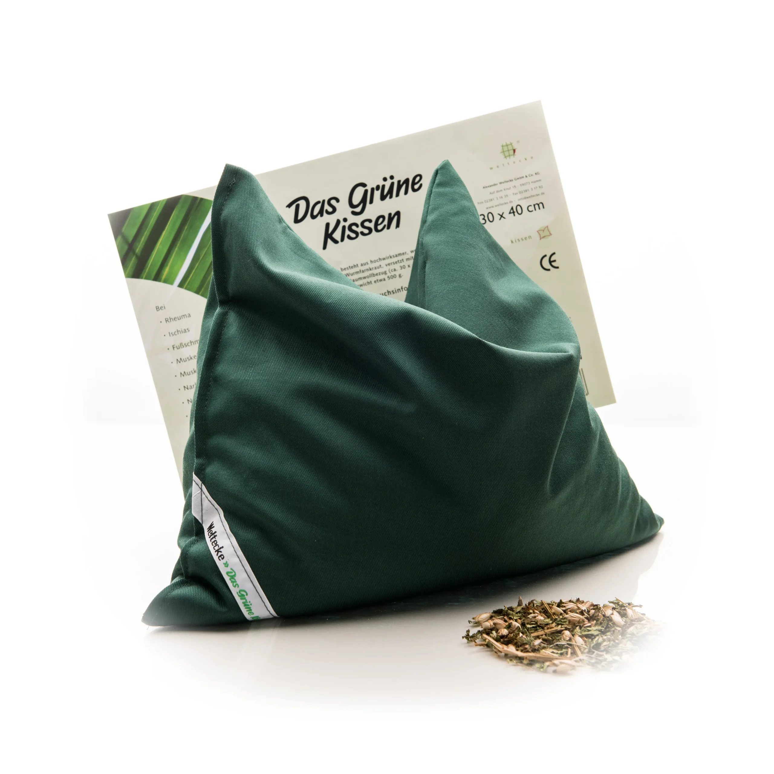 Dieses Kissen besteht aus hochwirksamer, weicher Kräuterfüllung ( 350 g Wurmfarnkraut, versetzt mit 70 g Dinkelspelz ) in grünem Baumwollbezug mit Plastikhülle.