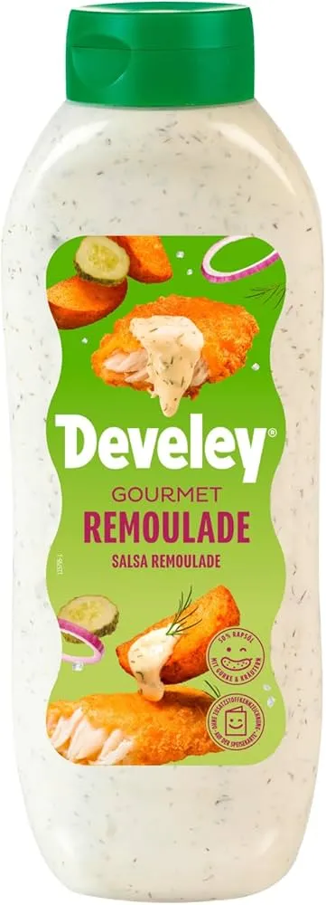 Cremig-würzige Verfeinerung für Ihre Speisen Genießen Sie die cremig-würzige Verfeinerung mit der DEVELEY REMOULADE in der großzügigen 875 ml Flasche. Diese klassische Remoulade überzeugt mit ihrem einzigartigen Geschmack und ihrer cremigen Konsistenz. Perfekt als Dip für Pommes, Fischstäbchen oder Meeresfrüchte, als Aufstrich für Sandwiches oder als Beilage zu gegrilltem Fleisch und Gemüse. Die 875 ml Flasche bietet ausreichend Remoulade für Ihre kulinarischen Kreationen zu Hause oder den Einsatz in der Gastronomie. Bestellen Sie jetzt und verleihen Sie Ihren Speisen eine cremig-würzige Note mit DEVELEY REMOULADE. Schnelle Lieferung für geschmackvolle Genussmomente. Zutaten: 50% Rapsöl, Trinkwasser, Zwiebeln, 6,5% Gurken, Branntweinessig, Zucker, Kräuter, modifizierte Stärke, Salz, Gewürze (mit SENF), Gewürzextrakt, Verdickungsmittel (Xanthan), Festigungsmittel (Calciumchlorid). Nährstoffe: Pro 100 ml BRENNWERT 1842 kJ / 447 kcal FETT 47.4 g – DAVON GESÄTTIGTE FETTSÄUREN 3.3 g – davon einfach ungesättigte Fettsäuren – – davon mehrfach ungesättigte Fettsäuren – KOHLENHYDRATE 4.1 g – DAVON ZUCKER 3.1 g – davon mehrwertige Alkohole – – davon Stärke – Ballaststoffe – EIWEISS 0.4 g SALZ 1.1 g Hersteller: Develey Senf & Feinkost GmbH Schlüsselwörter: DEVELEY REMOULADE, 875 ml, Cremig, Würzig, Dip, Aufstrich, Beilage, Gastronomie, Großpackung