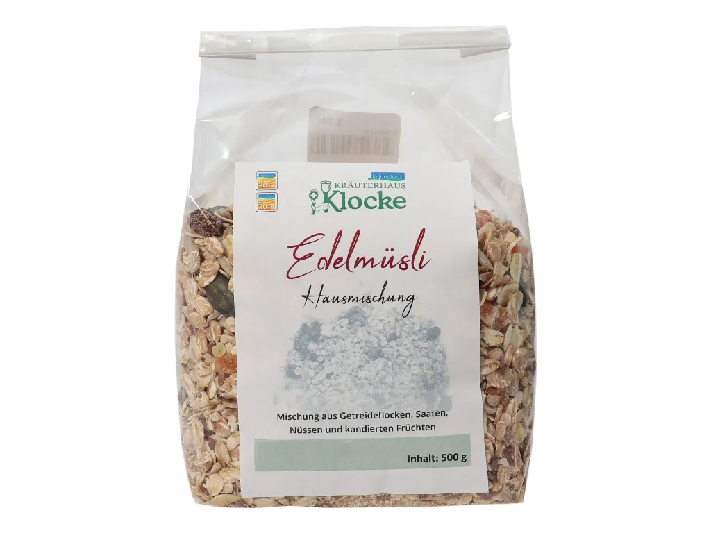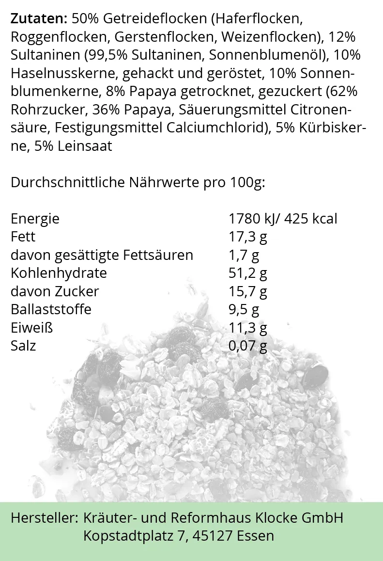 Zutaten: 50% Getreideflocken (Haferflocken, Roggenflocken, Gerstenflocken, Weizenflocken), 12% Sultaninen (99,5% Sultaninen, Sonnenblumenöl), 10% Haselnusskerne, gehackt und geröstet, 10% Sonnenblumenkerne, 8% Papaya getrocknet, gezuckert (62% Rohrzucker, 36% Papaya, Säuerungsmittel Citronensäure, Festigungsmittel Calciumchlorid), 5% Kürbiskerne, 5% Leinsaat