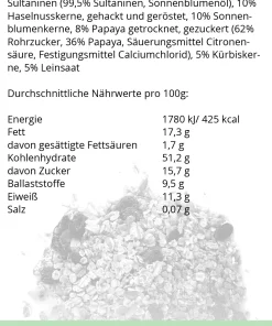 Trockenfrüchte 28% (Sultaninen (mit Sonnenblumenöl), Äpfel, Himbeeren gefriergetrocknet), HAFERFLOCKEN, WEIZENFLOCKEN, ROGGENFLOCKEN, GERSTENFLOCKEN, Cornflakes 5% (Mais, Zucker, Salz, GERSTENMALZEXTRAKT), Sonnenblumenkerne, Reismehl