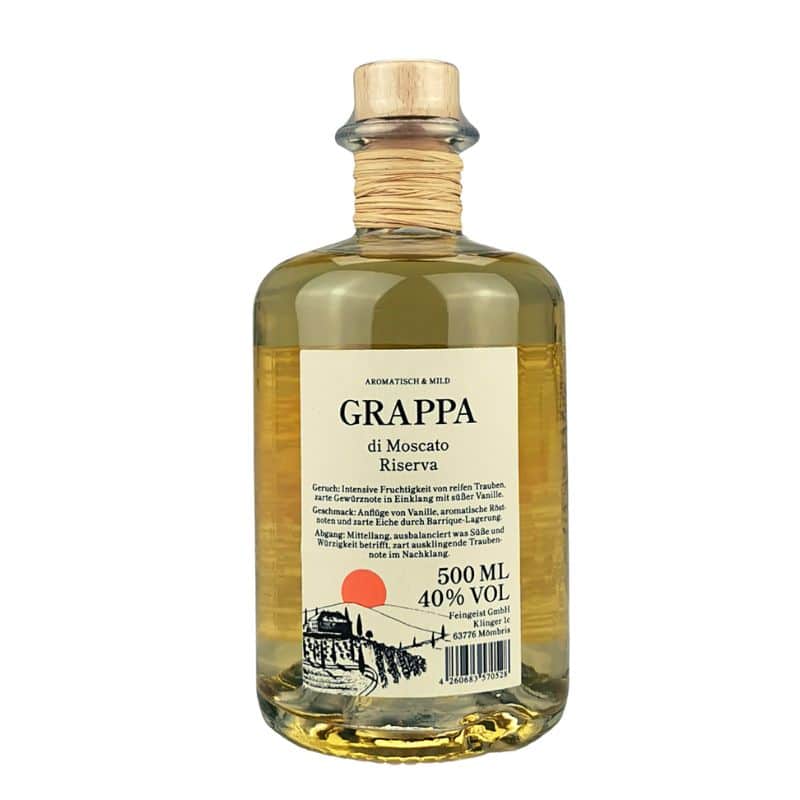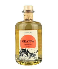 Den besonderen Geschmack erhält der Grappa di Moscato Riserva durch die aromatische Moscato-Traube, welche über ein spezielles und intensives Geschmackserlebnis hervorruft. Durch den Ausbau in Barrique-Fässern gesellt sich zudem eine Note von Zitrusfrüchten, Hölzern und Röstaromen sowie Vanille.