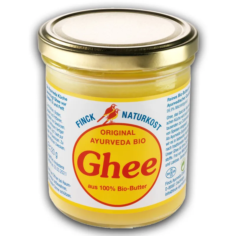 Die ayurvedische Küche bevorzugt Finck Naturkost Ghee bio vor Butter, Öl und Fett. Es entfacht Agni/das Verdauungsfeuer und ist das am leichtesten verdauliche Fett in der Natur.