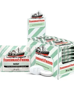 Fisherman’s Friend Mint ohne Zucker bietet erfrischenden Minzgeschmack in 24 praktischen 25g-Beuteln. Die zuckerfreien Pastillen sind vegan, ideal für unterwegs oder als kleiner Snack zwischendurch.