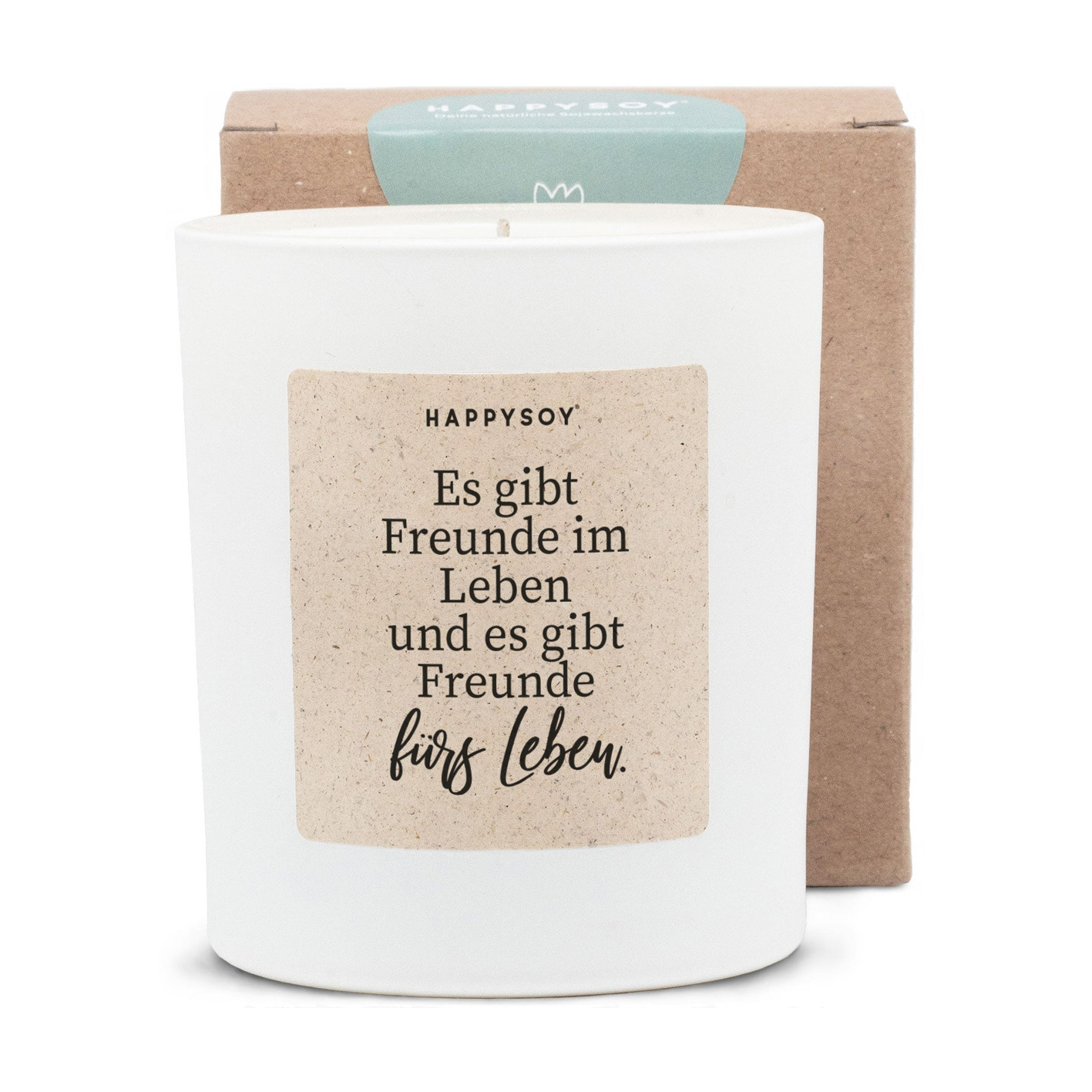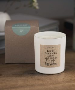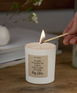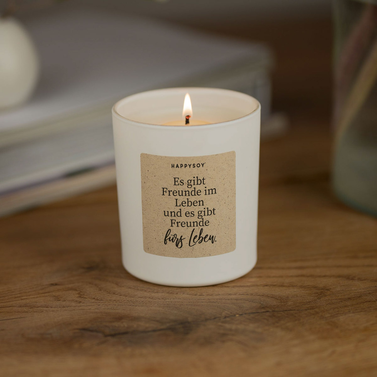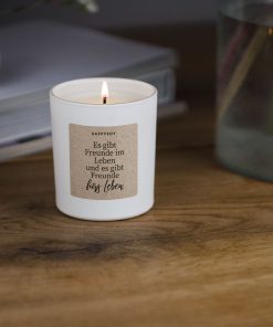 Duftkerze | Mattes, weißes Glas | Spruch “Es gibt Freunde im Leben und es gibt Freunde fürs Leben” | Größe: 8 x 9 cm | Duft: Miaflora | Inhalt: 220g Sojawachs | Handgemacht in der hauseigenen Manufaktur | ohne Dekoration