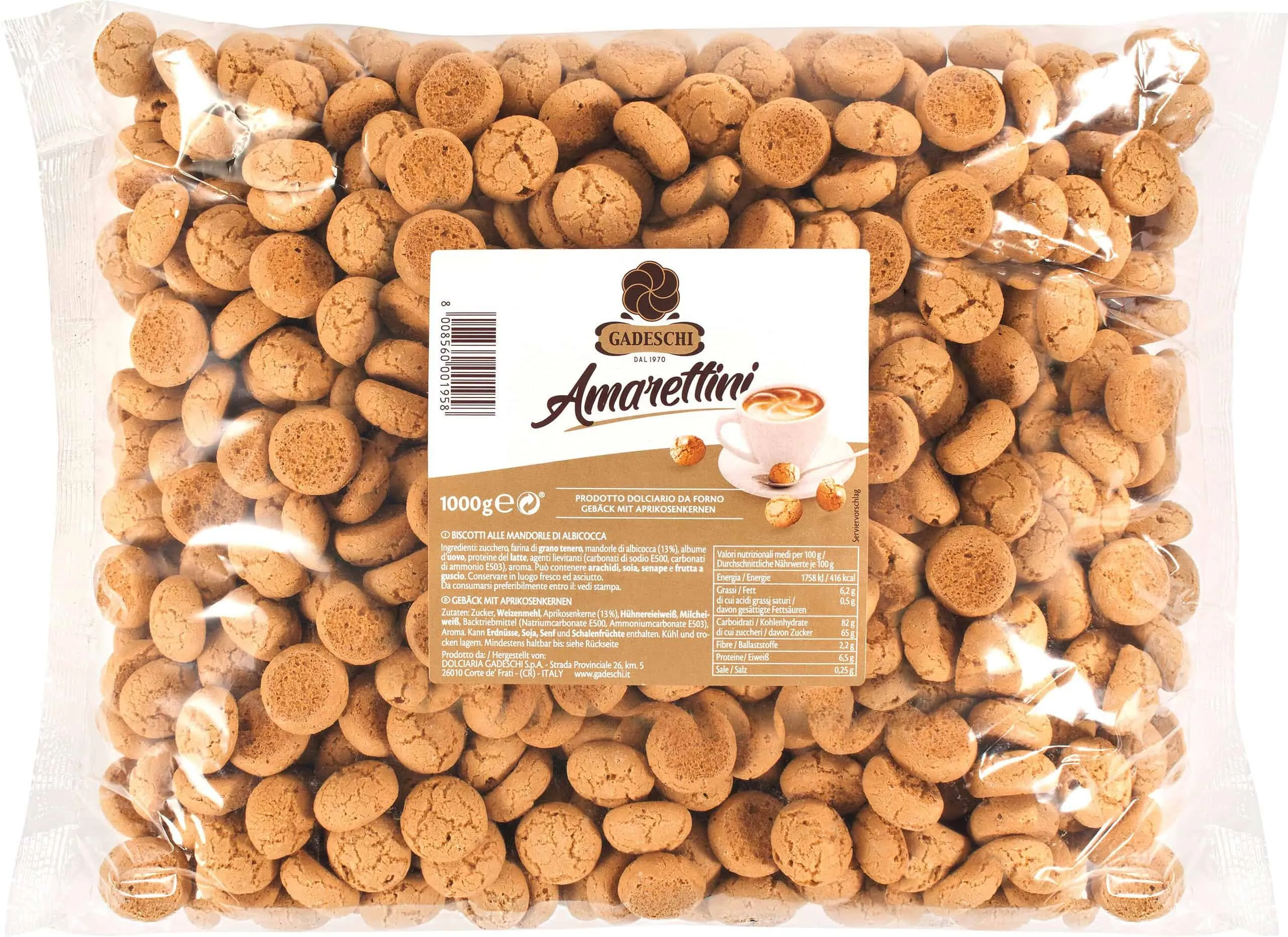Zutaten: Zucker, WEICHWEIZENMEHL, Aprikosenkerne (13%), HÜHNEREIEIWEISS, MILCHEIWEISS, Backtriebmittel (Natriumhydrogencarbonat E500, Ammoniumhydrogencarbonat E503), Aromen. Kann Spuren von ERDNÜSSEN und anderen SCHALENFRÜCHTEN enthalten.