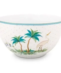 Dieser Teller eignet sich perfekt für Gebäck oder zum Frühstück und schafft ein tropisches Feeling zuhause. Er ist verziert mit verschiedenen tropischen Pflanzen und Tieren, goldenen Punkten und einem goldenen Rahmen.