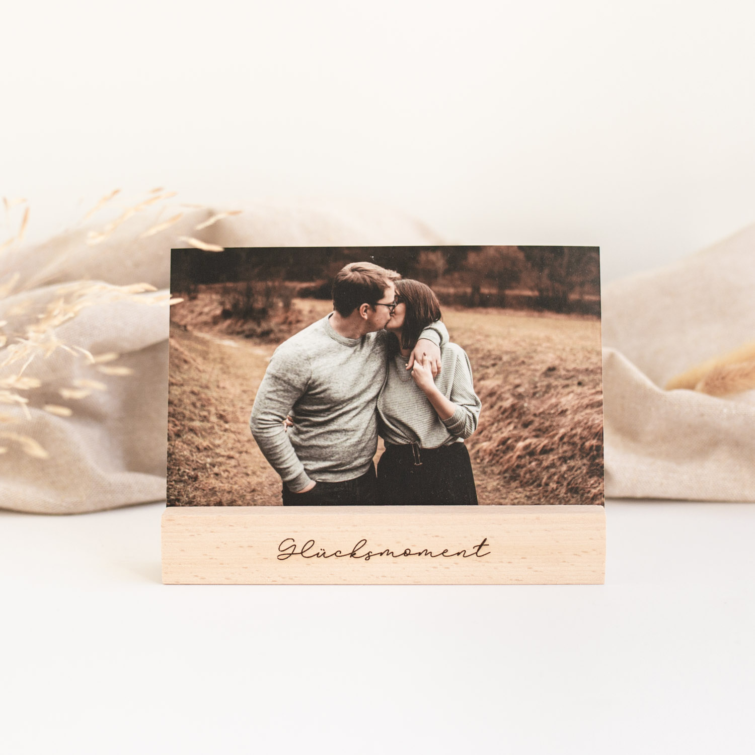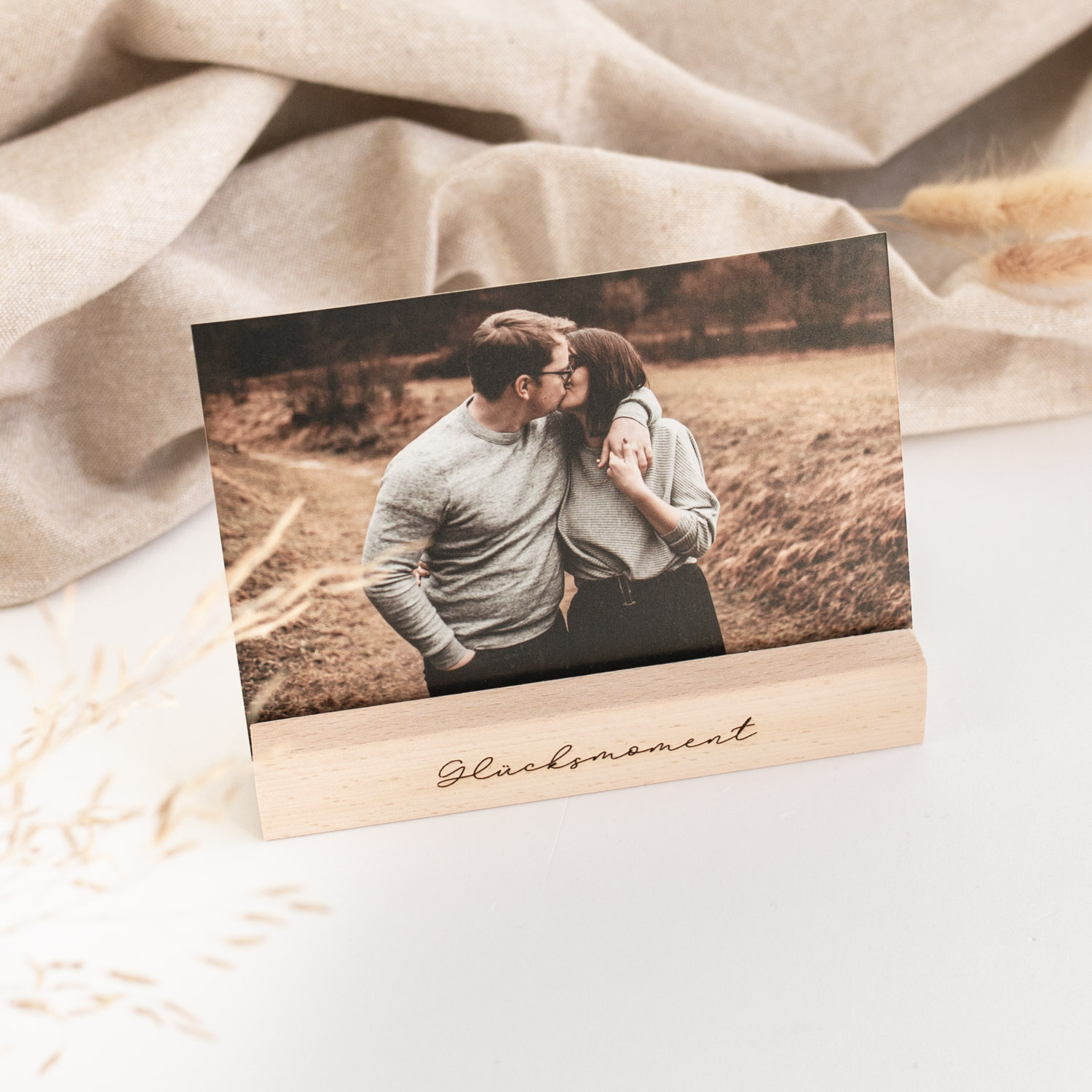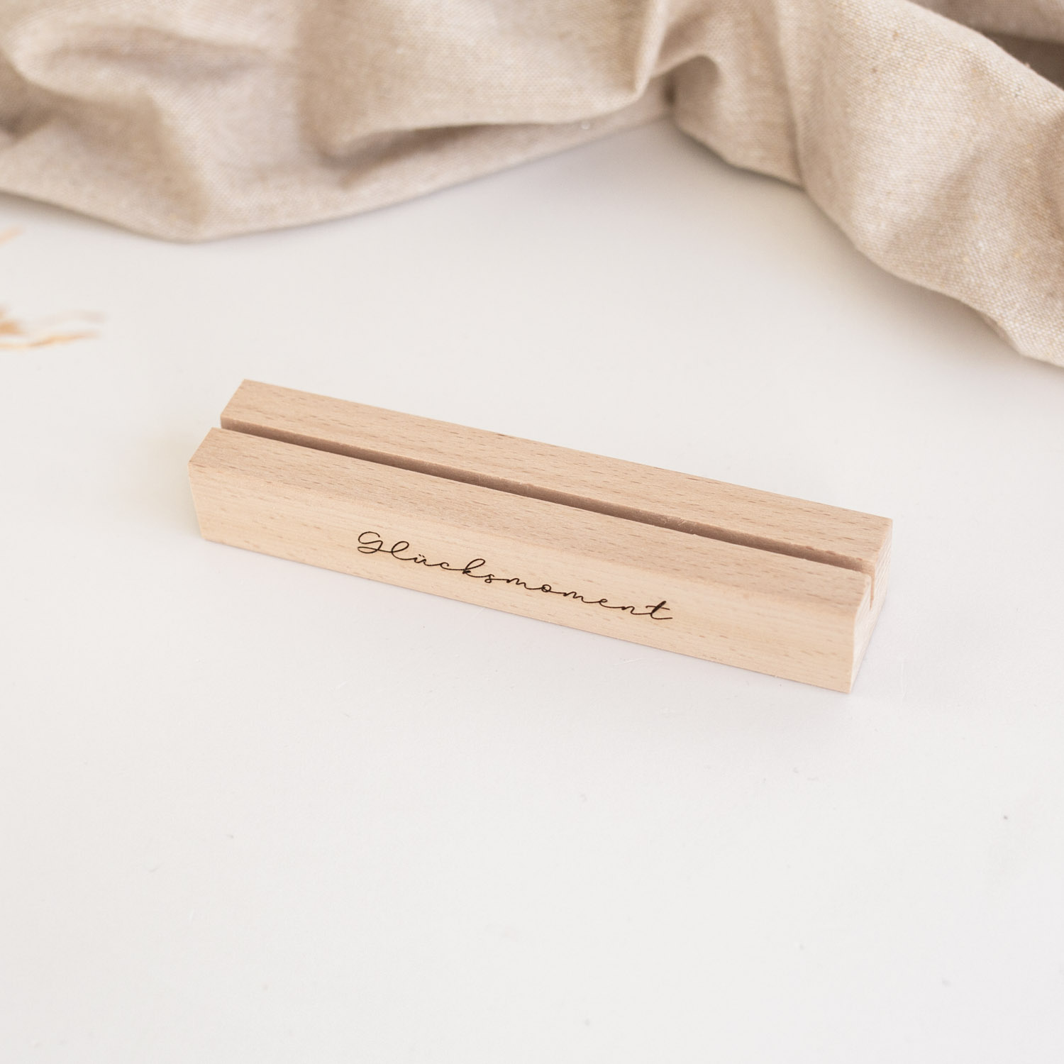 Mit diesem Kartenhalter setzt du Fotos, Postkarten, Tisch- oder Menükarten perfekt in Szene. Der Fotohalter ist mit dem Wort “Glücksmoment” graviert.