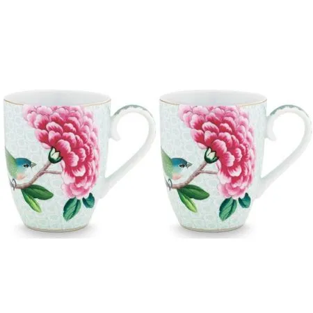 große Tasse aus Porzellan verziert mit exotischen Blumen, einem Vogel und goldenen Details. Kombiniert mit Verzierungen am Griff und einem gemusterten Hintergrund. Perfekt für jedes Heißgetränk. Marke: Pipstudio Kollektion: Blushing Birds Inhalt: 350ml