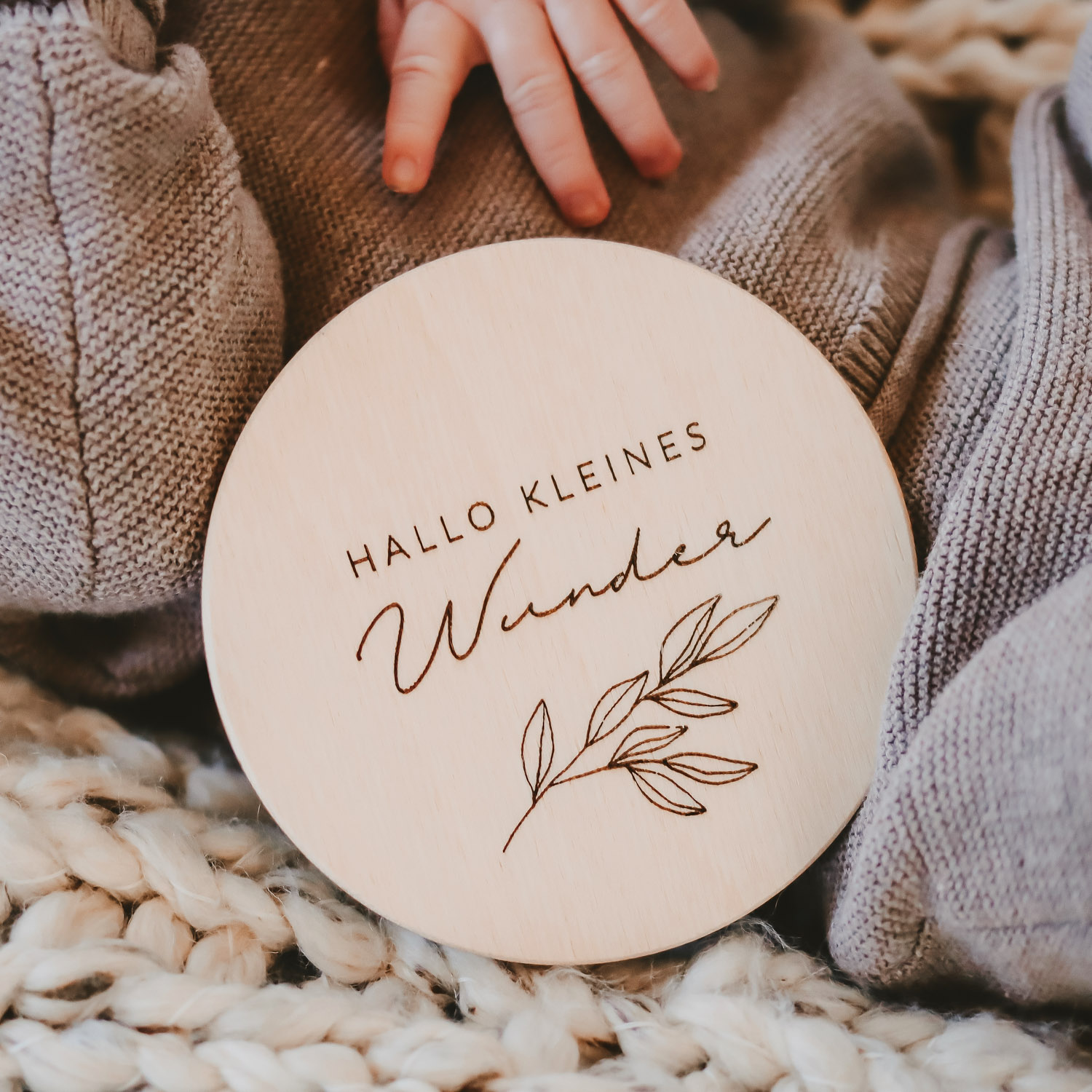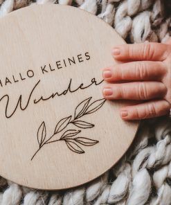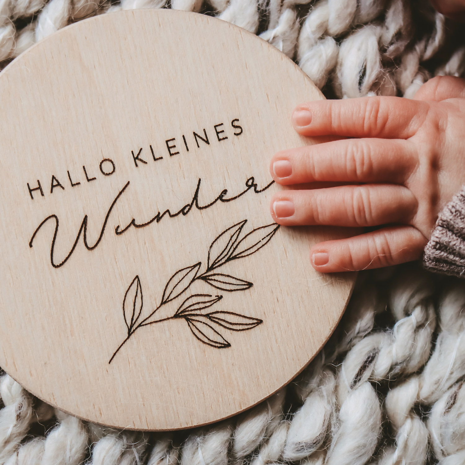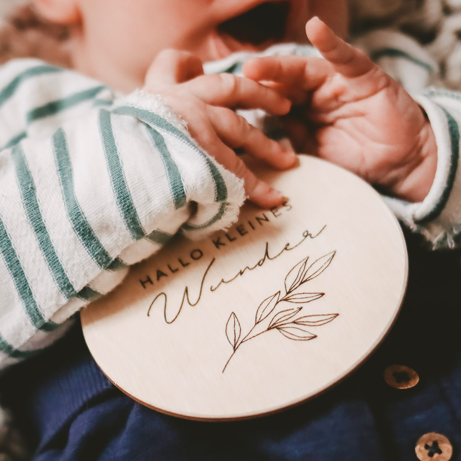 Eine lasergravierte Holzscheibe mit dem Spruch “Hallo kleines Wunder”, mit der ihr viele aufregende & emotionale Ereignisse kreativ festhalten könnt.
