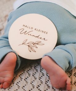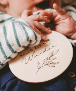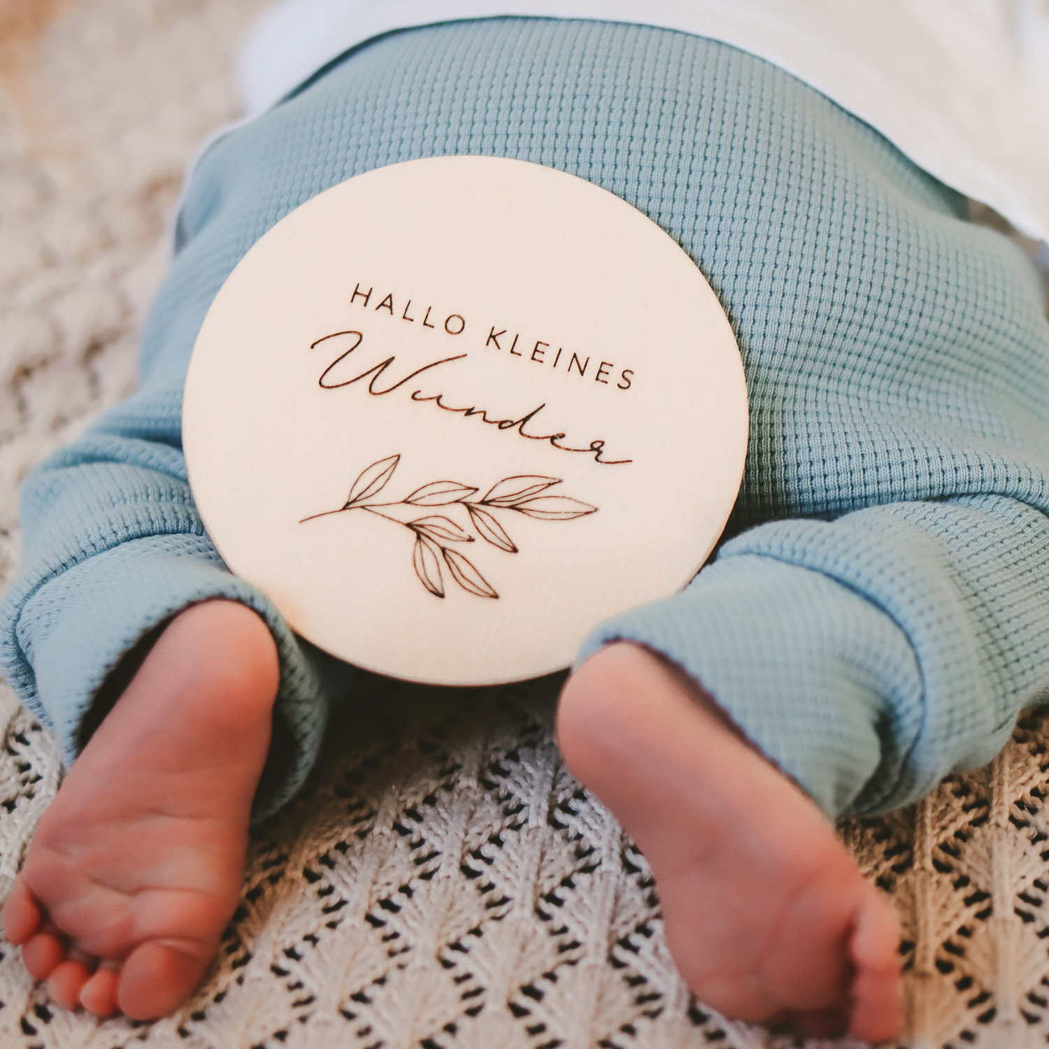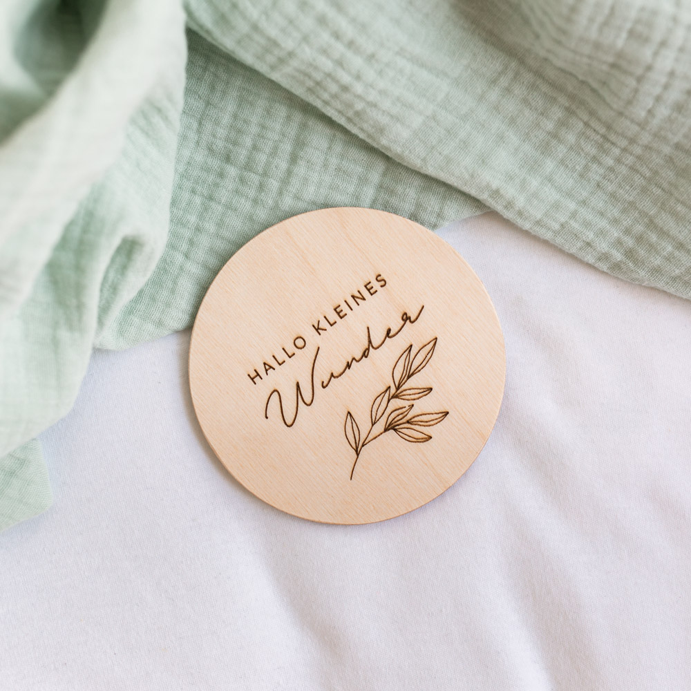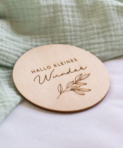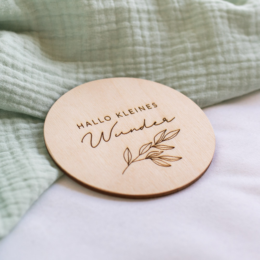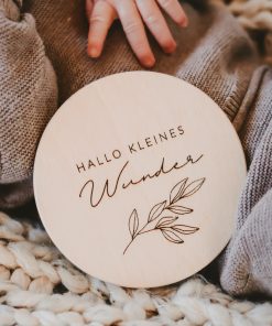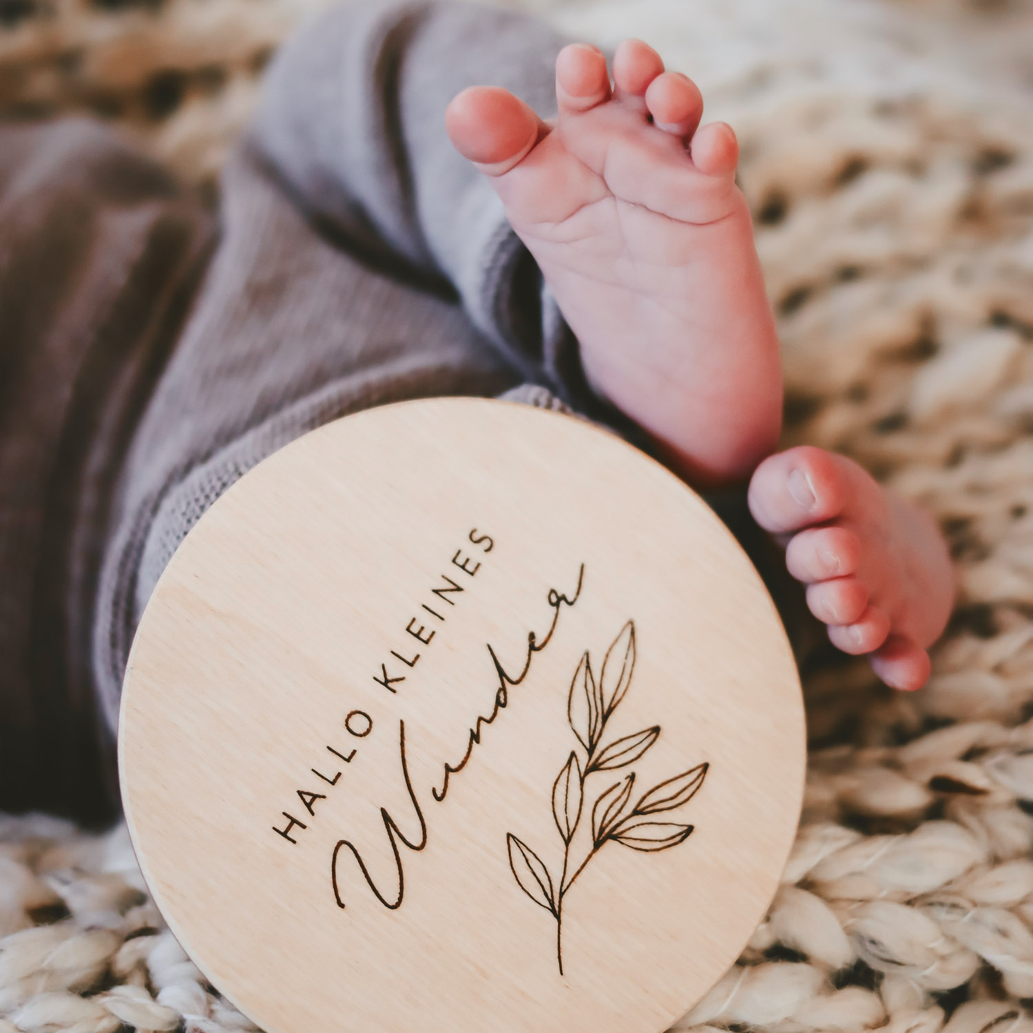 Eine lasergravierte Holzscheibe mit dem Spruch “Hallo kleines Wunder”, mit der ihr viele aufregende & emotionale Ereignisse kreativ festhalten könnt.