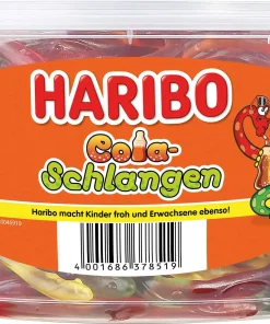 Die leckeren Cola-Schlangen von Haribo mit verschiedenen Geschmacksrichtungen aus Fruchtgummi sind in einer praktischen Haushaltsbox verpackt. Die Box beinhaltet 150 der fruchtigen Schlangen, die ohne künstliche Farbstoffe hergestellt werden. Für Kindergeburtstage oder zum Dekorieren ist diese saftige Nascherei perfekt geeignet und wird Ihnen einen extralangen Kaugenuss bescheren.