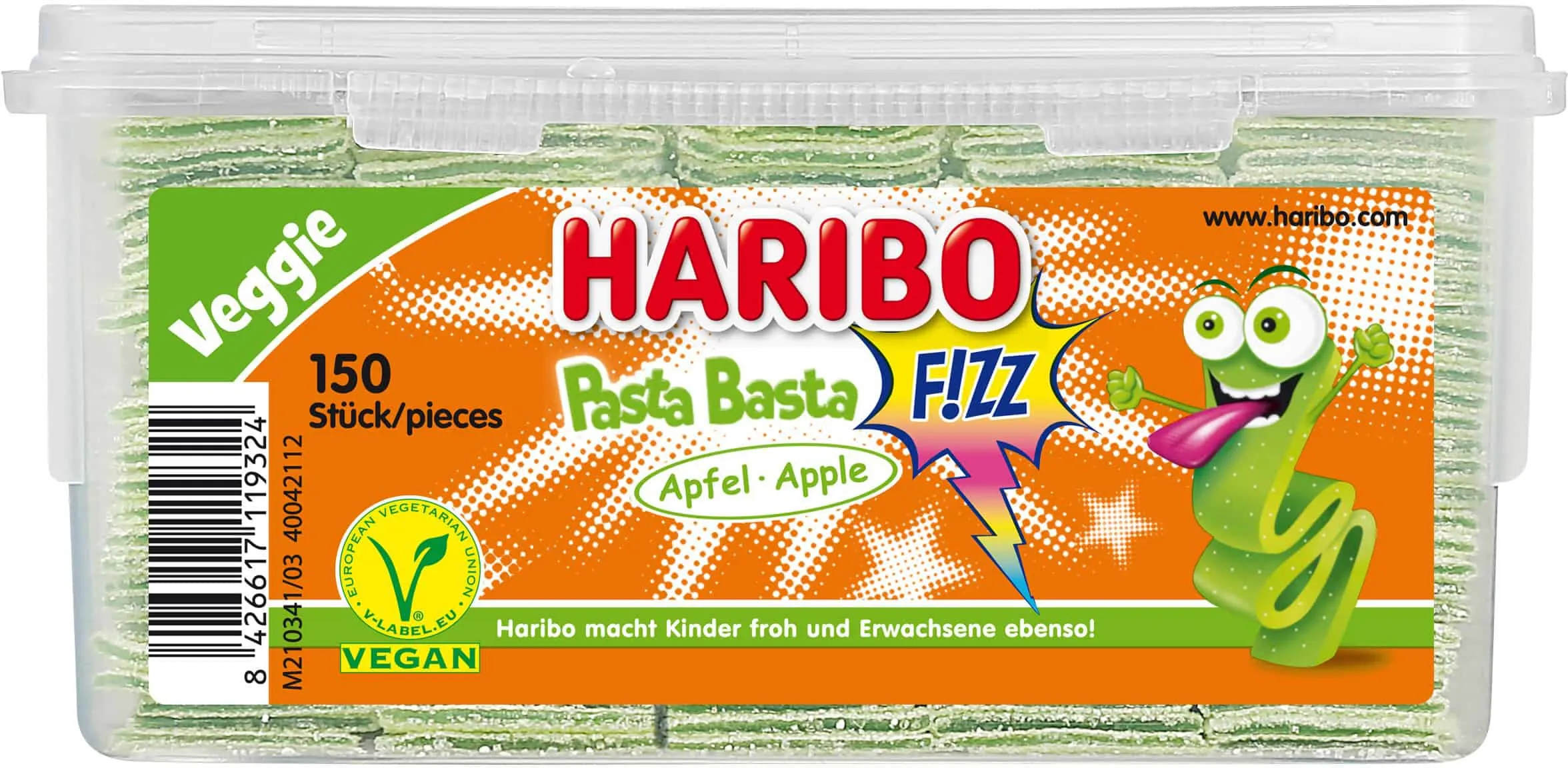 FRUCHTGUMMI Haribo Pasta Basta Apfel Sour ist die extrasaure Versuchung für alle Fans des sauren Geschmacks. Das unvergessliche Apfelaroma versprüht seinen Duft bereits, wenn die wiederverschließbare Frischebox geöffnet wird, sodass Du gar nicht anders kannst, als genüsslich in die sauer-kandierten Fruchtgummi-Streifen hineinzubeißen.