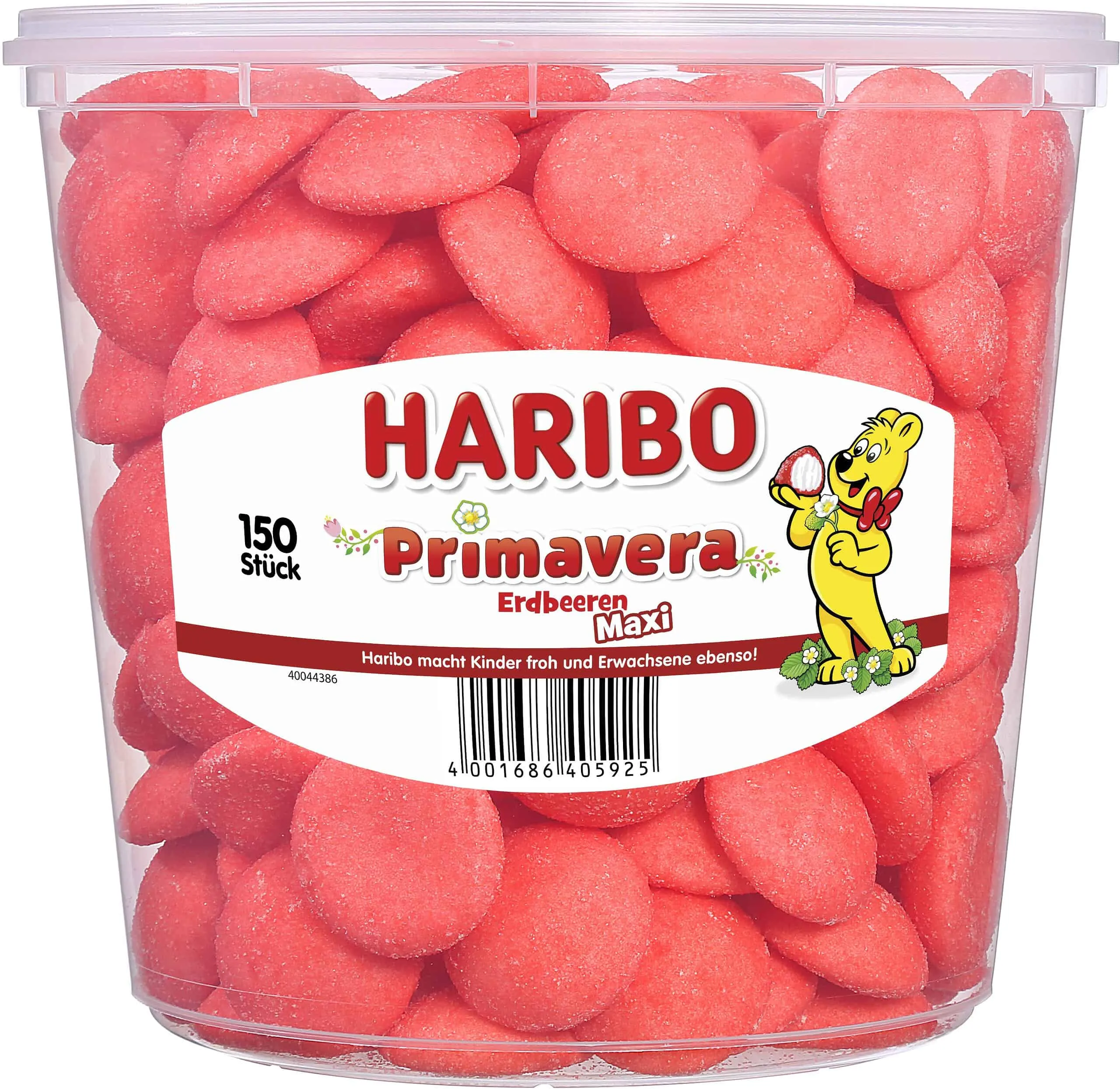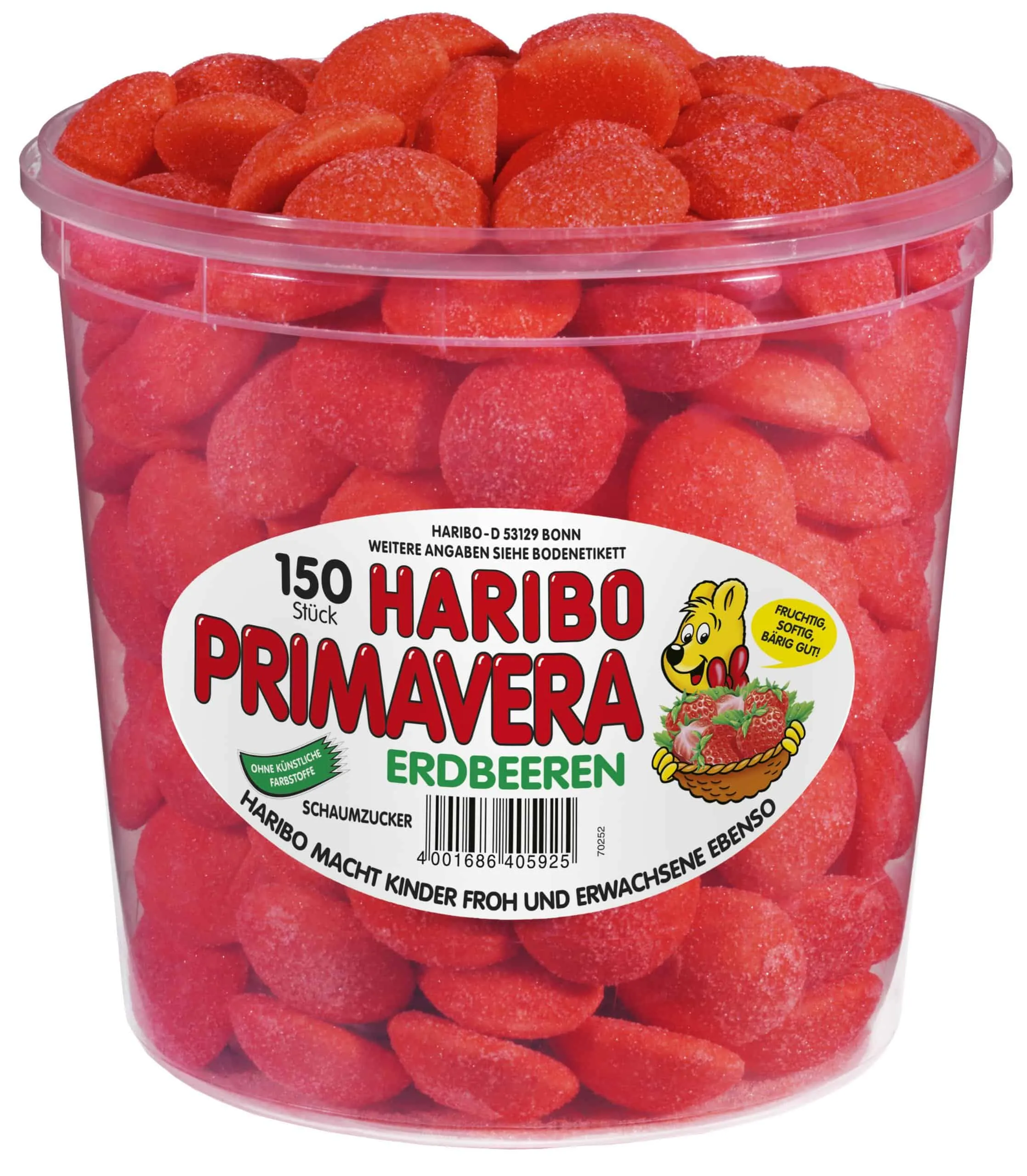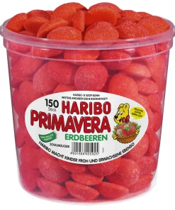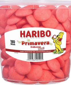 Beerig lecker. Haribo Primavera Erdbeeren bringen auf köstliche Weise den Frühling auf den Gaumen. Die ca. 3,5 cm großen gezuckerten Schaumzuckerstücke sehen mit ihrer roten Farbe nicht nur aus wie die beliebten Früchte, sondern zaubern zudem mit leckerem Erdbeer-Geschmack Jung und Alt ein Lächeln auf die Lippen. Beißen Sie in die knackigen Stücke und lassen Sie sich von dem soften Inneren verwöhnen. Und wenn der Vorrat aufgenascht ist, lässt sich die wieder verschließbare Dose problemlos weiter verwenden, um darin Leckereien oder andere Gegenstände zu verstauen.
