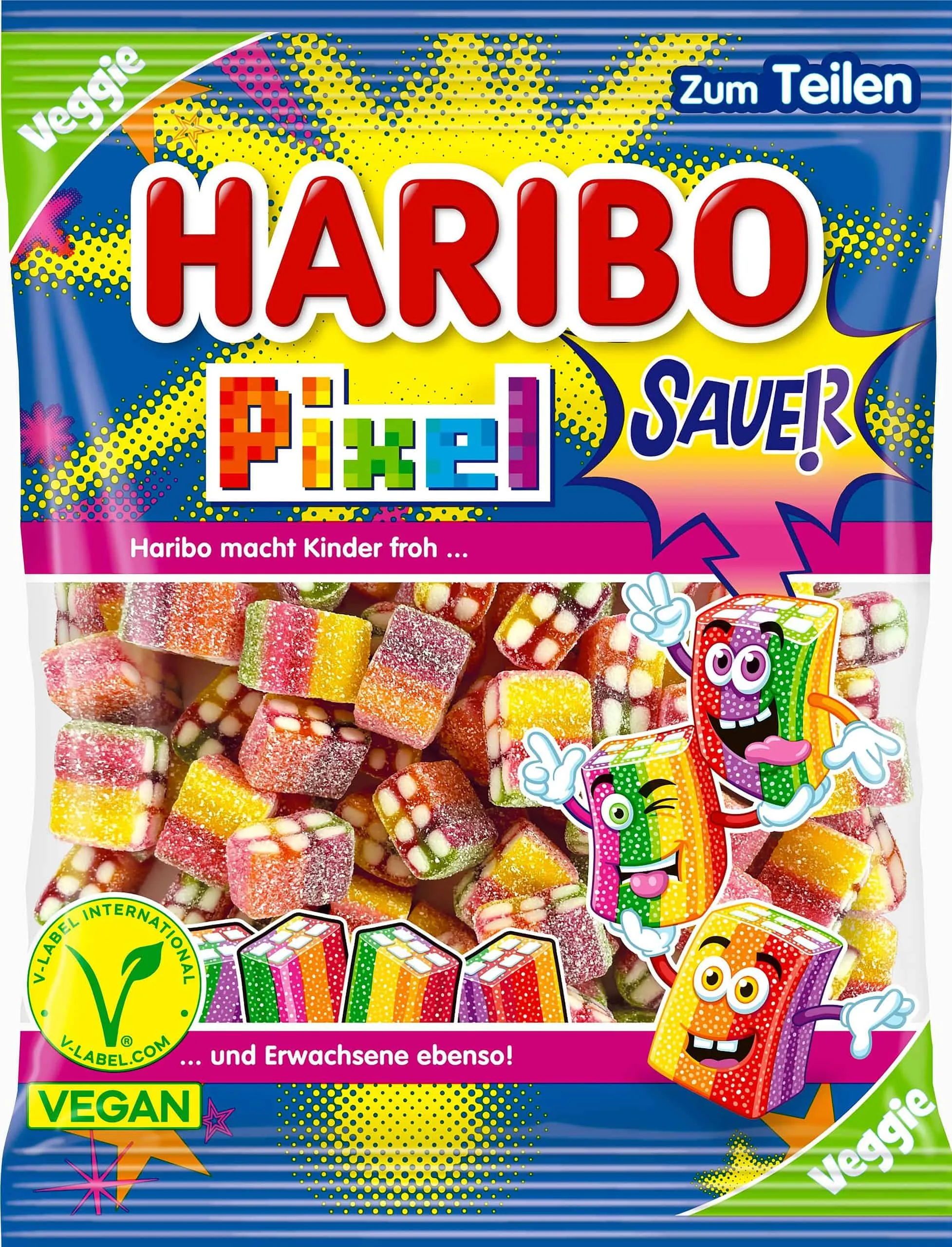 Haribo Rainbow Pixel sauer veggie, 160g, sind bunte Fruchtgummi-Ziegel mit softer Konfektfüllung und einer Umhüllung aus Zucker und mild-saurem Brausepulver. Diese veganen Süßigkeiten bieten ein prickelndes Geschmackserlebnis mit leckerem Fruchtgeschmack und strahlenden Regenbogenfarben. Haribo Rainbow Pixel sorgen für Begeisterung und unverwechselbaren Naschspaß.