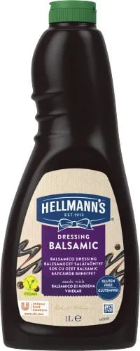 Verfeinern Sie Ihre Salate mit dem Geschmack von Balsamico Genießen Sie den vollmundigen Geschmack von HELLMANN’S BALSAMICO DRESSING! Dieses erstklassige Dressing kombiniert hochwertigen Balsamico-Essig mit ausgewählten Zutaten zu einer delikaten Mischung, die Ihre Salate zu etwas Besonderem macht. Die feine Balance zwischen Süße und Säure verleiht Ihren Gerichten eine unverwechselbare Note und sorgt für ein Geschmackserlebnis der Extraklasse. Ob als Topping für gemischte Blattsalate, als Marinade für mediterrane Gemüsesalate oder als Dip für knusprige Baguettes – mit HELLMANN’S BALSAMICO DRESSING verleihen Sie Ihren Speisen eine köstliche Verfeinerung. Die Flasche mit 1 Liter Inhalt bietet ausreichend Vorrat für zahlreiche Salatkreationen und ist ideal für den Einsatz in der Gastronomie oder im privaten Haushalt. Entdecken Sie jetzt die Qualität und den unverwechselbaren Geschmack von HELLMANN’S BALSAMICO DRESSING und verwöhnen Sie Ihren Gaumen mit jeder Mahlzeit.