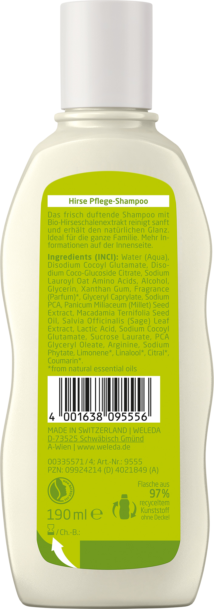 Produktbeschreibung: Das Weleda Hirse Pflege-Shampoo reinigt das Haar sanft und schonend, gibt mit Bio-Macadamianussöl, Extrakten aus Bio-Hirseschalen und Bio-Salbei dem Haar seinen natürlichen Glanz und Spannkraft zurück. Der Duft ist frisch durch Fruchtige Grapefruit, belebende Pfefferminze und holzig-warme Amyris. Ideal für normales Haar – für die ganze Familie. Ohne Silikone.