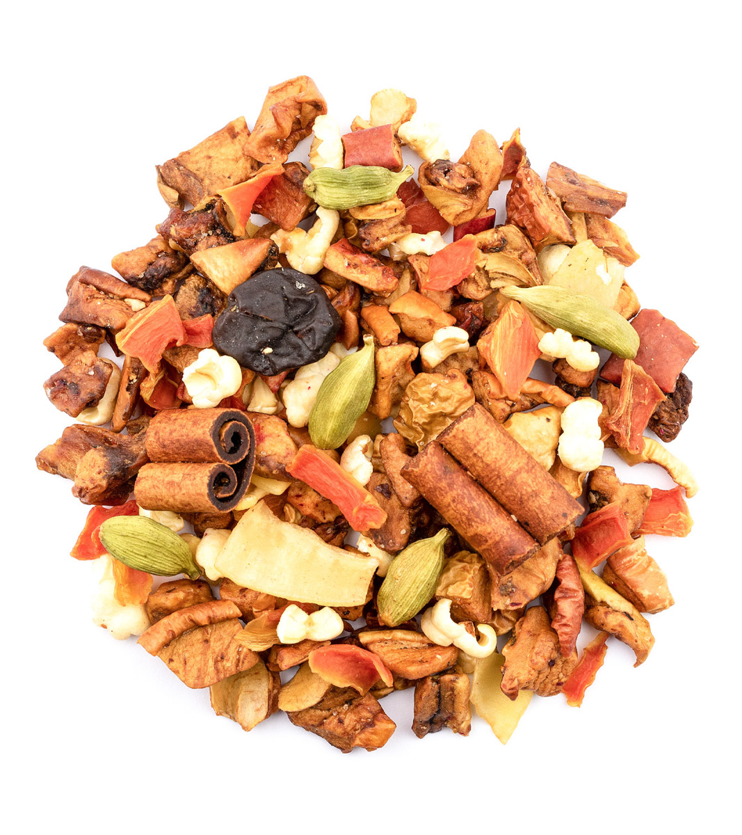 Apfelstücke (Apfel, Säuerungsmittel: Weinsäure, Wasser), geölte Weinbeeren (Weinbeeren, Sonnenblumenöl), kandierte Kirschen (Kirschen, Zucker, Sonnenblumenkernöl) (8%), gezuckerte und geröstete Kokoschips (Kokosnuss, Zucker), Karottenflocken, Aroma, Cassiarinde, Kardamomsamen, gefriergetrocknete Kirschen (2%), Puffreis, Rote Bete.