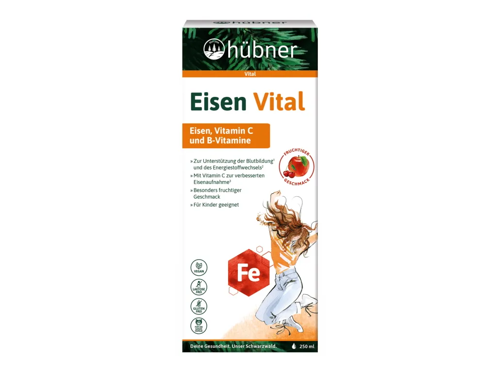 Eine ausreichende Eisenversorgung ist unerlässlich, um den Alltag energiegeladen meistern zu können. Doch es gibt Lebensphasen, in denen Menschen einen erhöhten Eisenbedarf haben und diesen durch die normale Ernährung nicht decken können. In diesem Fall ist die Anwendung eines Eisenpräparats sinnvoll. Hübner Eisen VITAL® Liquid ist ein Nahrungsergänzungsmittel mit hochwertigen Inhaltsstoffen, besonders für Menschen mit einem Eisendefizit.