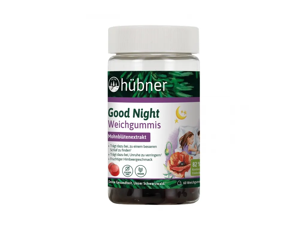 hübner® Good Night Weichgummis mit Klatschmohnblüten-Extrakt sind ohne Zucker, gluten- und laktosefrei, vegan und ohne künstliche Aromen sowie Farbstoffe. Sie können jederzeit ohne Wasser verzehrt werden.
