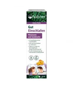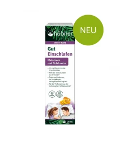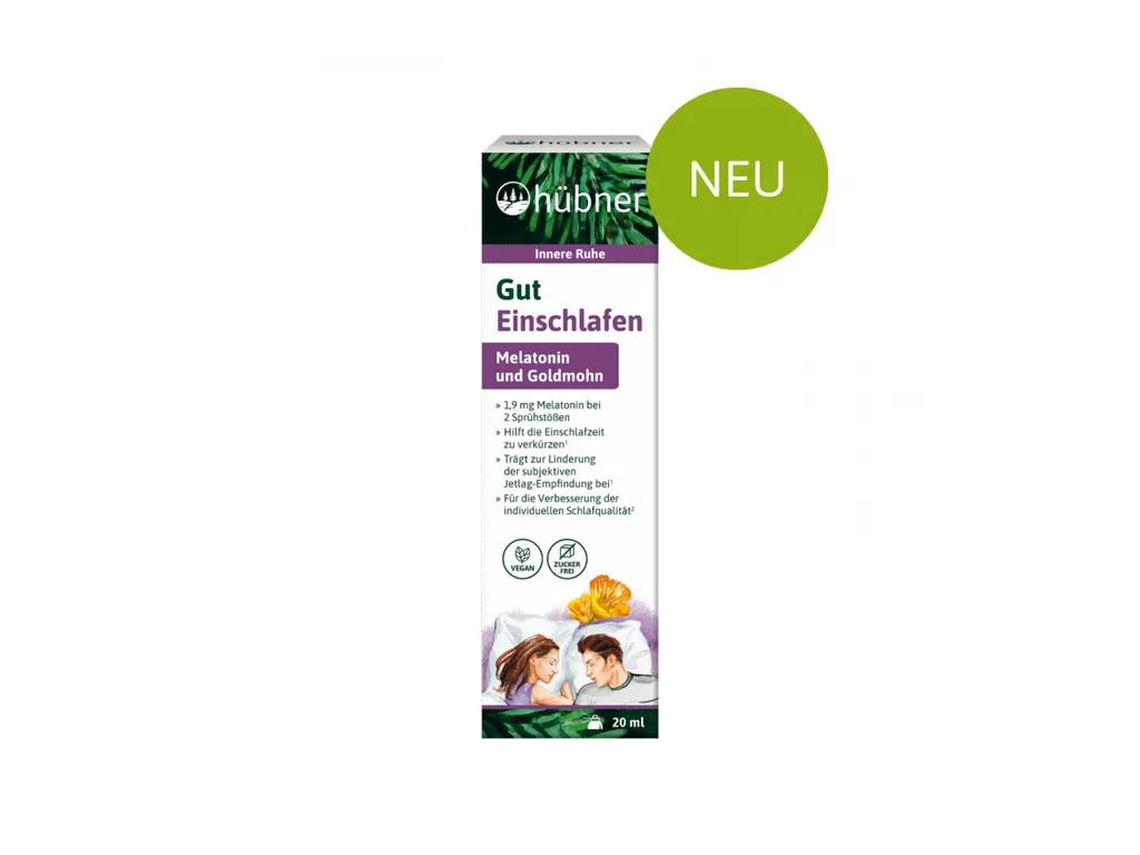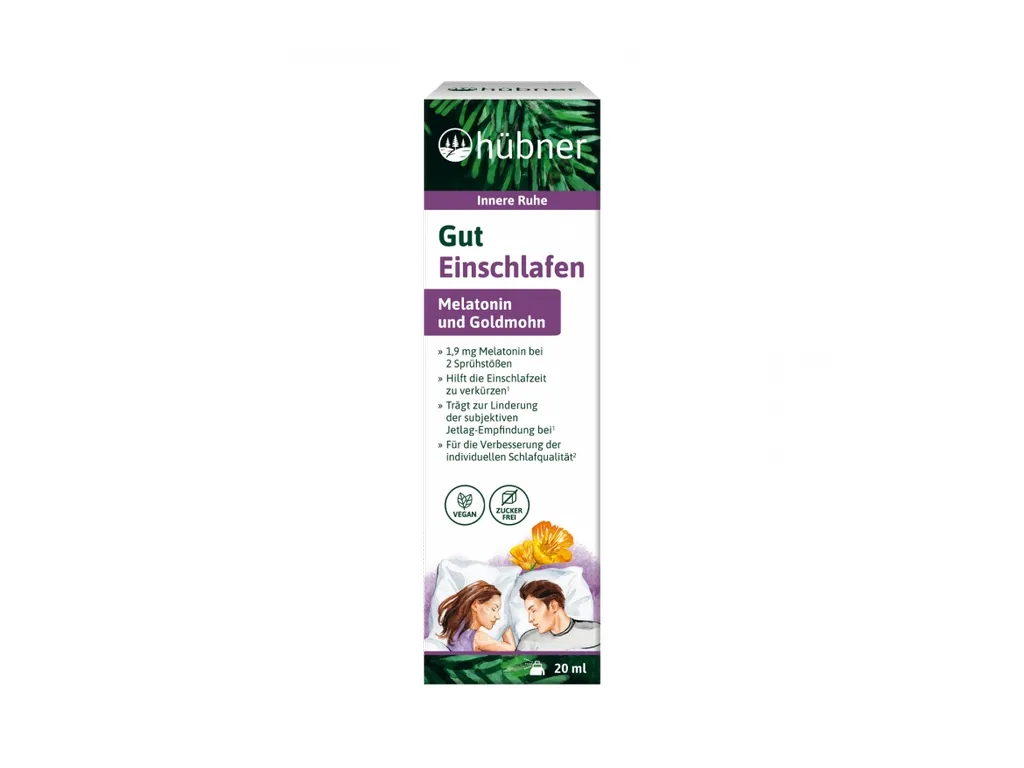hübner® Gut Einschlafen ist Deine schnelle und einfache Lösung für Deine innere Ruhe. Nahrungsergänzungsmittel mit Melatonin und Goldmohn. Mit Süßungsmittel.