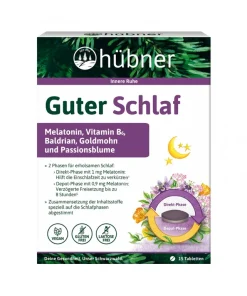 Genieße mit hübner® Guter Schlaf erholsame Nächte und unterstütze Deinen Schlafzyklus. Nahrungsergänzungsmittel mit Melatonin, Vitamin B6, Baldrian, Goldmohn und Passionsblume.