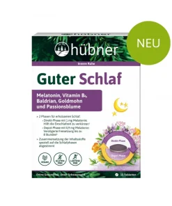 Genieße mit hübner® Guter Schlaf erholsame Nächte und unterstütze Deinen Schlafzyklus. Nahrungsergänzungsmittel mit Melatonin, Vitamin B6, Baldrian, Goldmohn und Passionsblume.