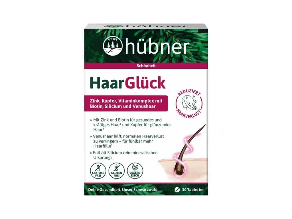 Hübner® HaarGlück enthält eine einzigartige Kombination aus sinnvoll zusammengestellten Inhaltsstoffen. Diese umfasst nicht nur die wertvollen Vitamine, Zink und Kupfer, um das Haar optimal zu versorgen, sondern zusätzlich: