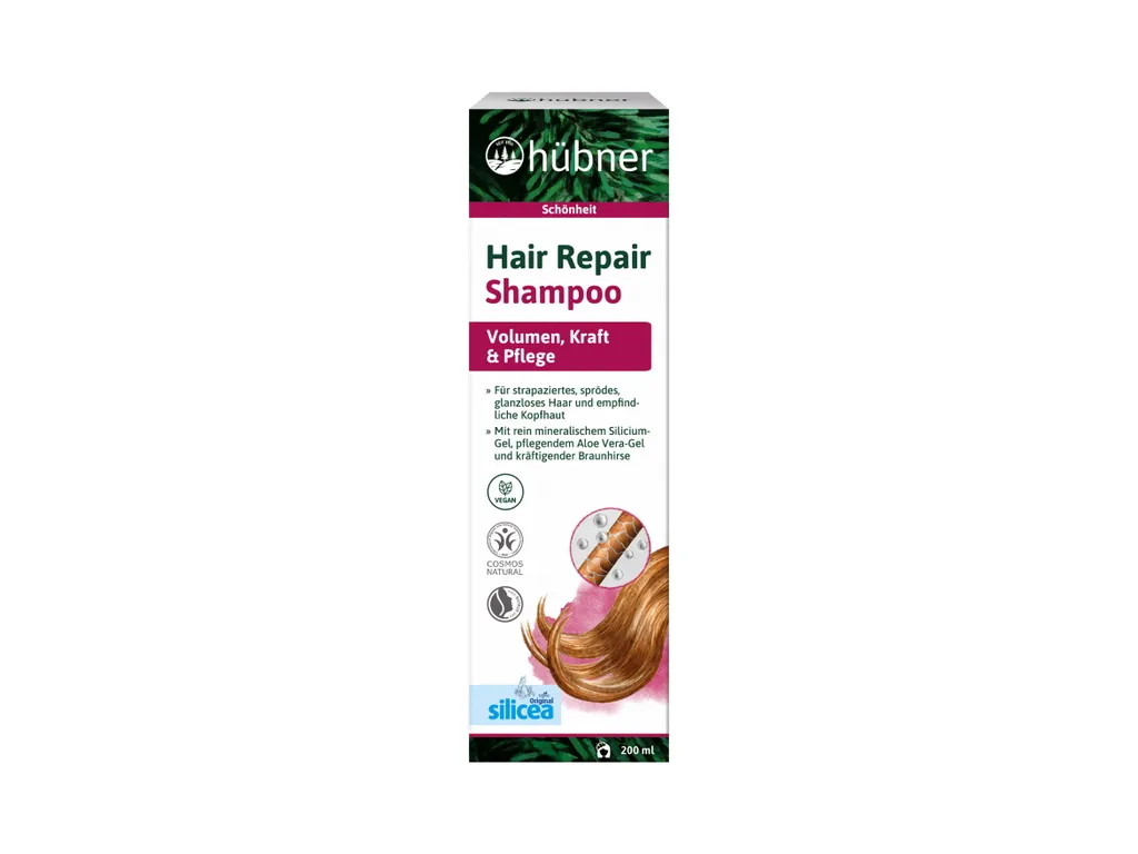 Zertifizierte, vegane Naturkosmetik für strapaziertes und geschädigtes Haar mit rein mineralischem Kieselsäure-Gel, pflegendem Aloe-Vera-Gel & kräftigender Braunhirse. (Alter Name: Hübner Original silicea® Hair Repair Shampoo).